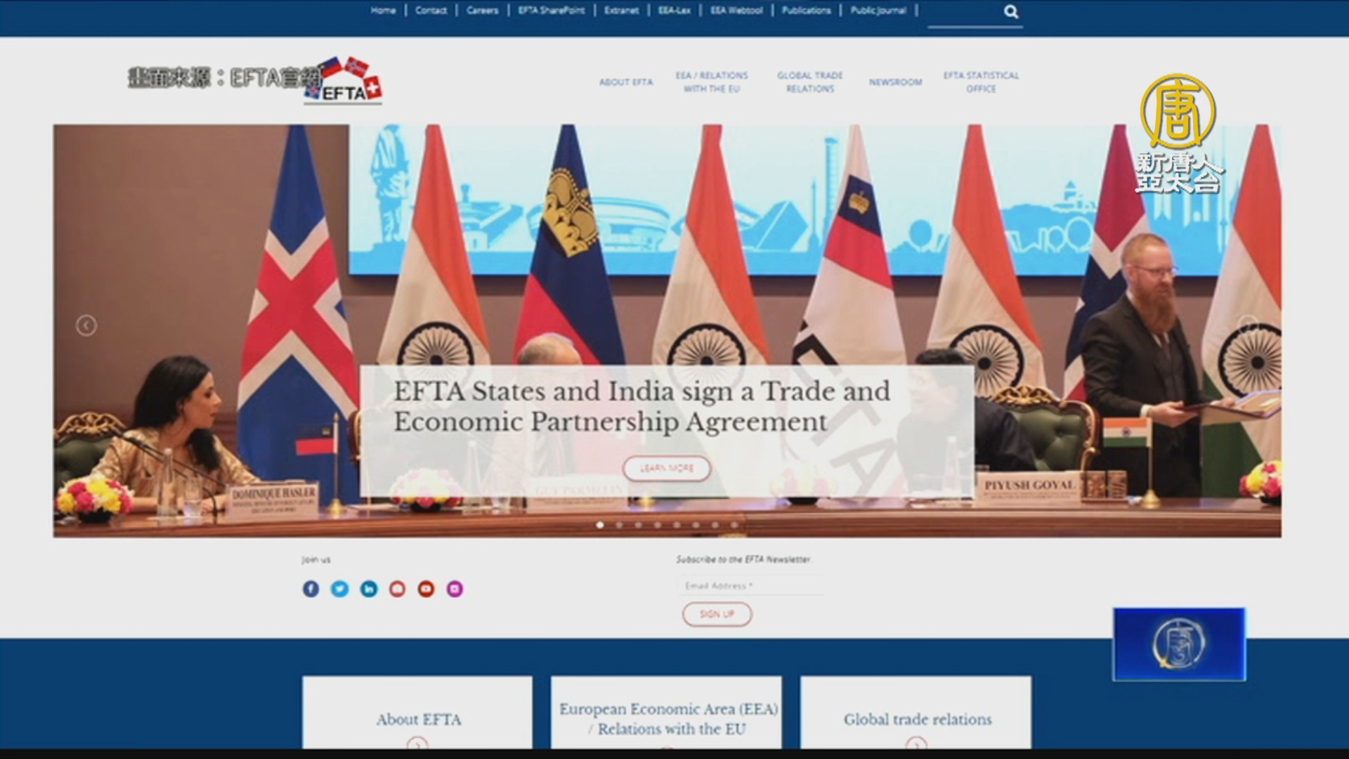 【新唐人亞太台 2024 年 03 月 11 日訊】供應鏈去中化成為一大趨勢,歐洲國家持續強化投資印度。印度貿易部長戈雅爾Piyush Goyal表示,與歐洲自由貿易聯盟協會(EFTA)簽下自由貿易協定,4大成員國包括瑞士、挪威、冰島與列支敦斯登承諾,未來15年內,在印度市場投入1千億美元,促進雙方的貿易和投資關係。戈雅爾強調,這項協定能夠帶來巨大的貿易與投資機會,將帶動經濟成長。