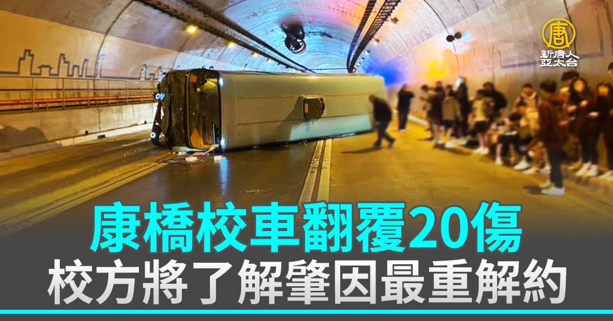 【新唐人亞太台 2024 年 03 月 12 日訊】康橋中學校車昨晚在台北市文山隧道內翻覆,20人受傷就醫。造成20人受傷。校方說,將先了解司機肇事原因,最嚴重情況一定是解約,甚至對校車公司也會有罰則。交通部公路局昨晚表示,經過調查翻覆車輛在103年出廠,車輛車籍正常,今年1月才剛通過檢驗,不過近6年有8次違規紀錄,駕駛近6年也有2件違規紀錄。