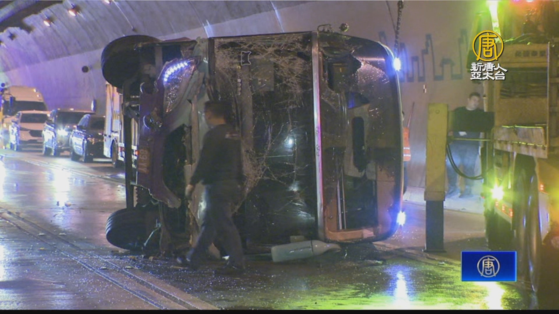 隧道內,一輛遊覽車疑似突然打滑,先是轉了半圈,車頭摩擦牆壁,還冒出陣陣火花。緊接著整輛車又旋轉了一大圈,應聲翻覆,橫躺在兩個車道上。