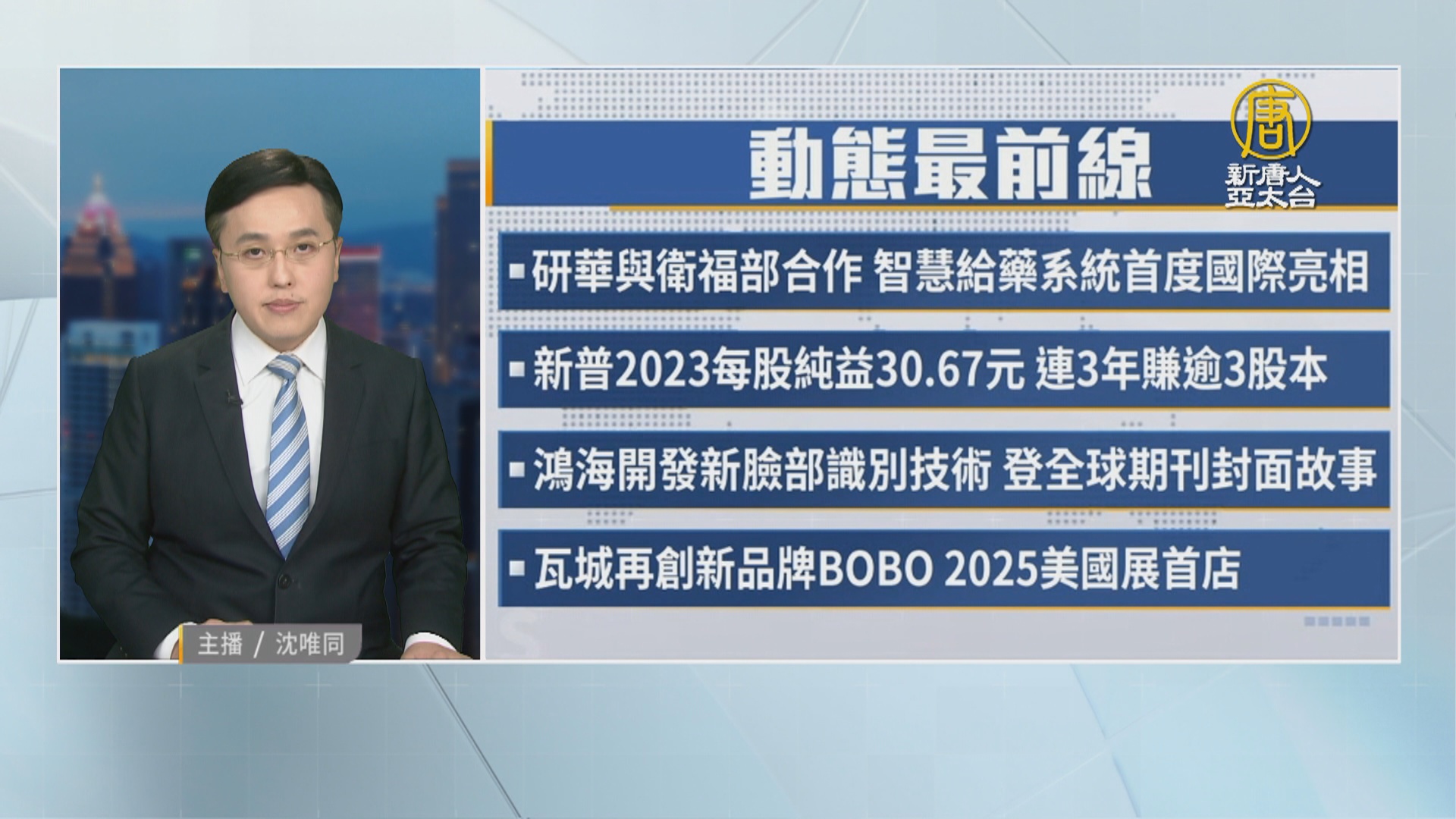 【新唐人亞太台 2024 年 03 月 13 日訊】帶您看到今天的產業動態。研華攜手衛福部,參加在美國的數位醫療館聯合展,展示一系列智慧醫療解決方案,包括智慧用藥、智慧護理站等,首度次在國際展亮相。電池大廠新普公布去年財報,全年營收新台幣848.05億元,年減11.3%,創下近4年新低;稅後純益56.73億元,換算每股純益30.67元,連續第3年賺進超過3個股本。鴻海今天宣布,旗下鴻海研究院半導體所攜手陽明交大,發展「新穎深度感測與臉部識別系統」,突破空間計算極限,相關論文正式發表在全球期刊奈米通訊,獲選為期刊的 2月封面故事。瓦城董事長徐承義表示,預計在2030年全球達到30個品牌、500店,今年再有2個新品牌,目前瓦城共有148店,估到年底將達到160店。