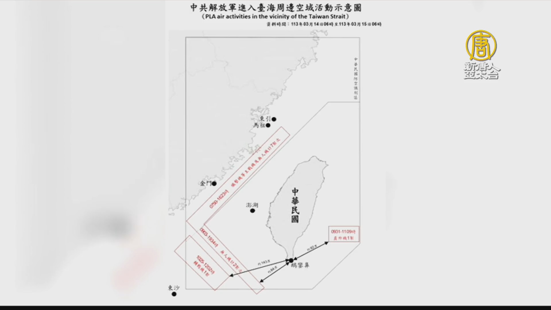 【新唐人亞太台 2024 年 03 月 15 日訊】中華民國國防部15日發佈共軍動態,前一天偵獲11架次共機,在台灣周邊活動,其中四架進入台灣西南與東部空域,另有八艘共艦活動。國軍運用任務機艦及岸置飛彈系統嚴密監控應處。