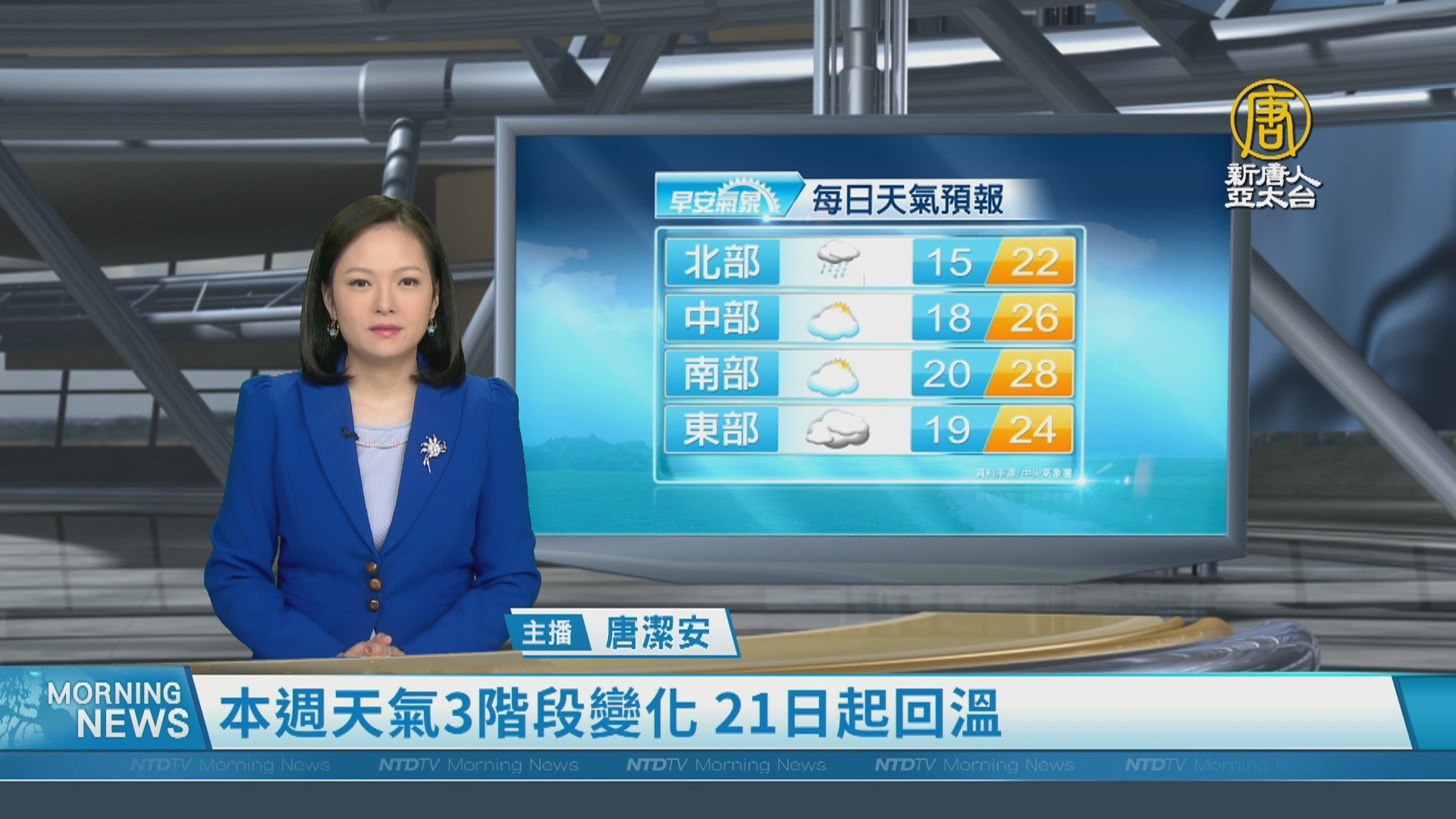 【新唐人亞太台 2024 年 03 月 18 日訊】歡迎您收看3月18日的早安新唐人,我是唐潔安,先來帶您關心天氣。因為微弱鋒面通過及大陸冷氣團南下,今天北部及東北部天氣逐漸轉冷,冷氣團會持續影響至週四清晨,北部低溫約攝氏13、14度,竹苗可能出現11度左右;預計週四之後,天氣會回穩至週末。帶您一起來看到國際媒體重要訊息。