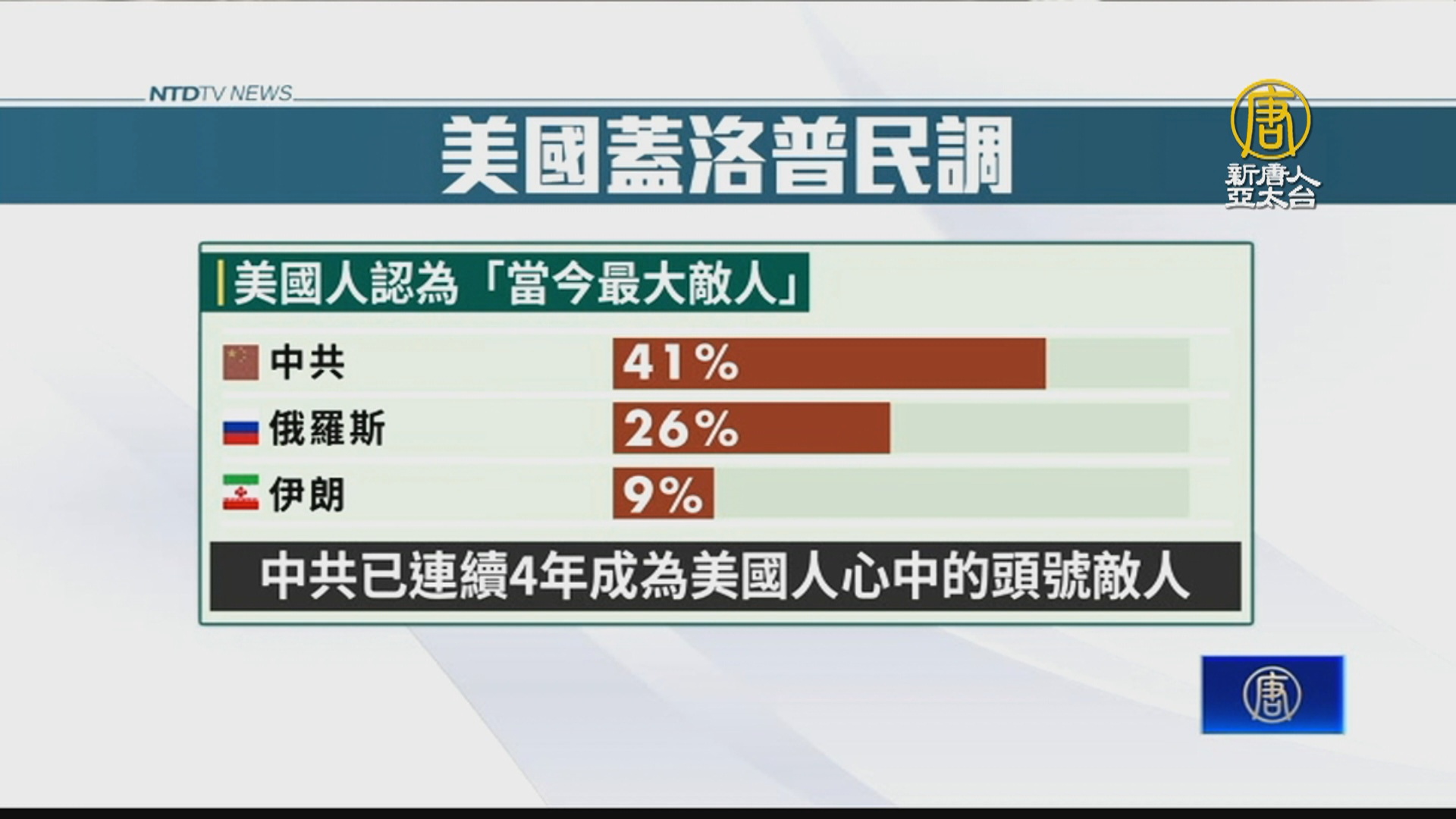 【新唐人亞太台 2024 年 03 月 20 日訊】美國民調公司蓋洛普18日公布最新民調顯示,美國人對台灣好感度77%,高居各國第六名,僅次於加拿大、日本、英國、德國、法國。值得關注的是,同樣的評比,美國人對中共的反感度則是高達77%。另外,美國人認為「當今最大敵人」有41%認為是中共,其次是俄羅斯26%,伊朗9%,中共已連續4年成為美國人心中的頭號敵人。