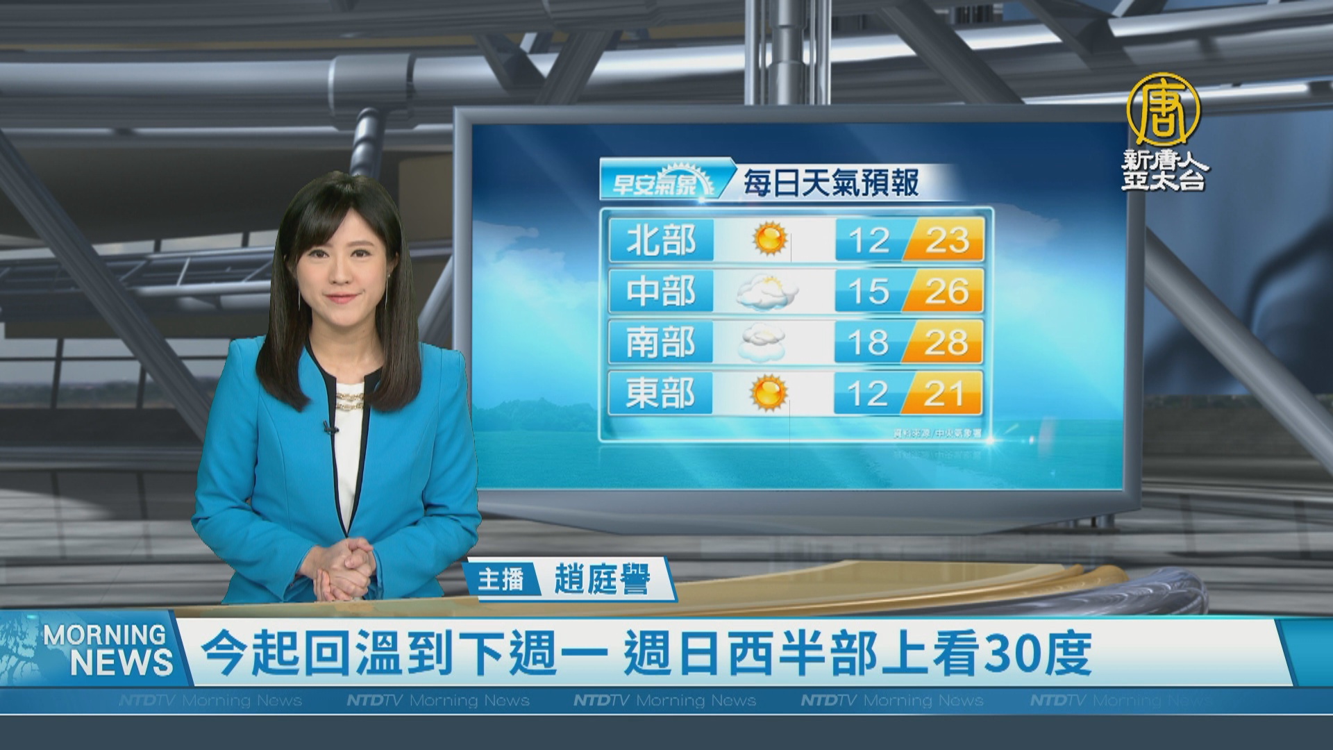 【新唐人亞太台 2024 年 03 月 21 日訊】歡迎您收看3月21日的早安新唐人,我是趙庭譽,先來帶您關心天氣。從今天開始,白天氣溫將逐漸回溫,一直到下週一,北台灣會回溫到20度以上,週日西半部地區高溫甚至可達30度以上,不過,從下週二(26日)起,可能有另外一波冷空氣影響。帶您一起來看到國際媒體重要訊息。