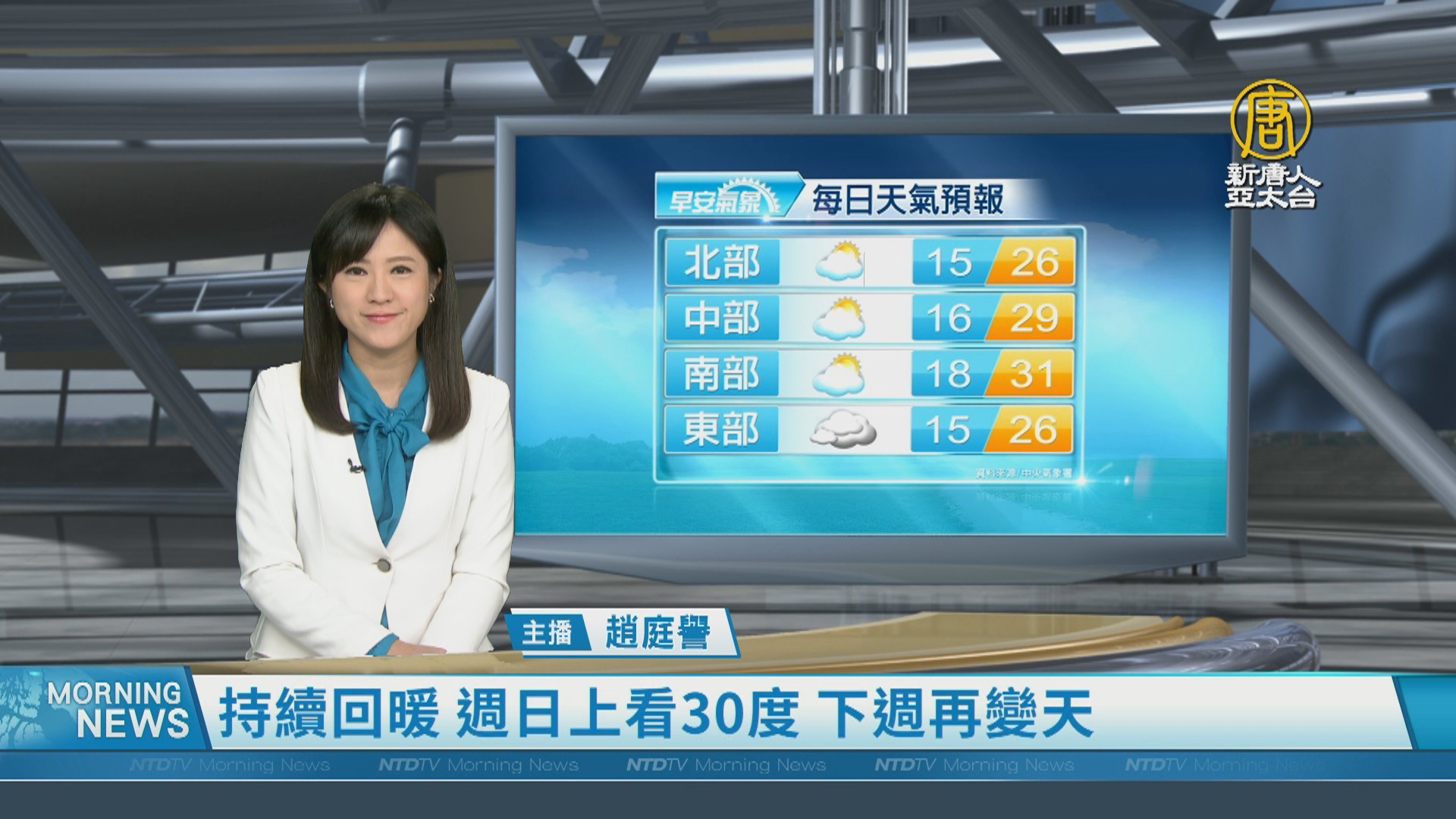 【新唐人亞太台 2024 年 03 月 22 日訊】歡迎您收看3月22日的早安新唐人,我是趙庭譽,先來帶您關心天氣。今天各地溫暖穩定,溫度又更加回升,北部及東半部白天高溫可以來到24至26度,中南部為26至28度,週日高溫上看30度,但下周又會變天,最低溫只剩16度。帶您一起來看到國際媒體重要訊息。