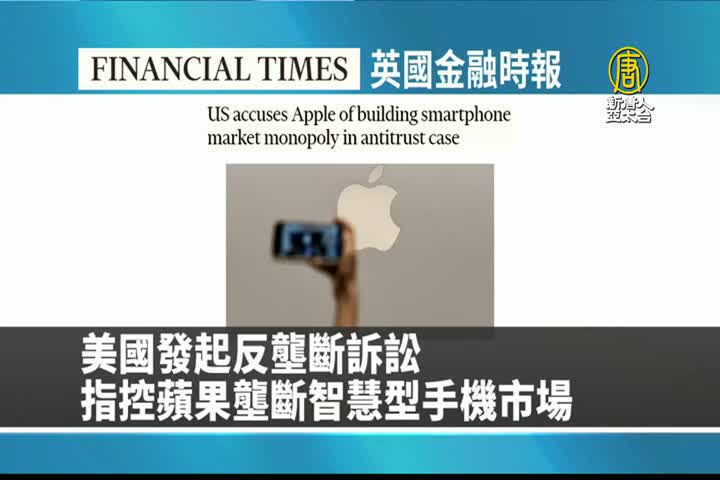 【新唐人亞太台 2024 年 03 月 22 日訊】接著是英國金融時報的報導:美國發起反壟斷訴訟,指控蘋果壟斷智慧型手機市場。
