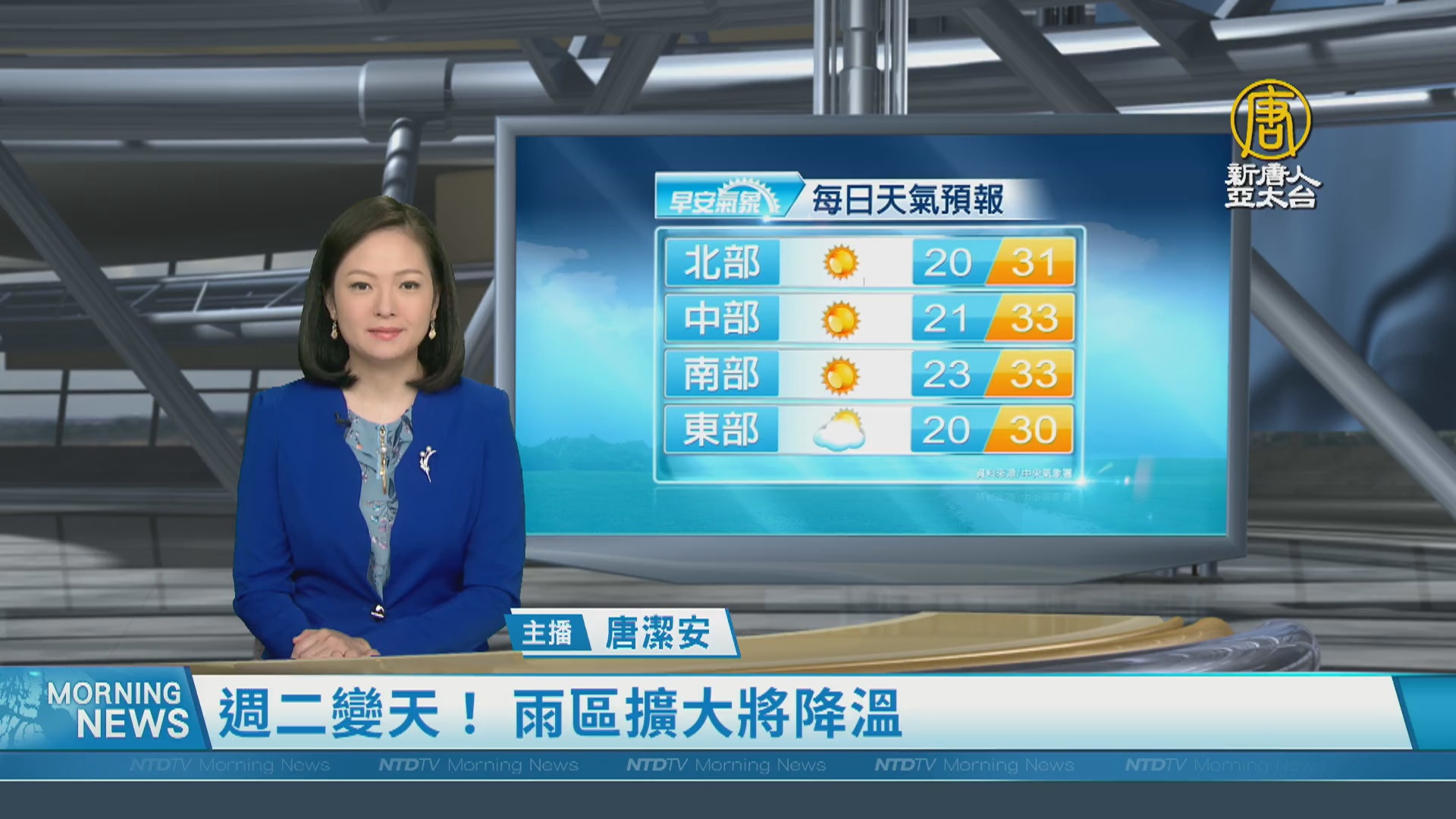 【新唐人亞太台 2024 年 03 月 25 日訊】歡迎您收看3月25日的早安新唐人,我是唐潔安,先來帶您關心天氣。今天各地白天依舊溫暖偏熱,北部及東半部高溫約28至31度,中南部可以來到33、34度以上,明天周二鋒面通過及東北季風增強,北部、東半部先後轉為有短暫雨的天氣。帶您一起來看到國際媒體重要訊息。
