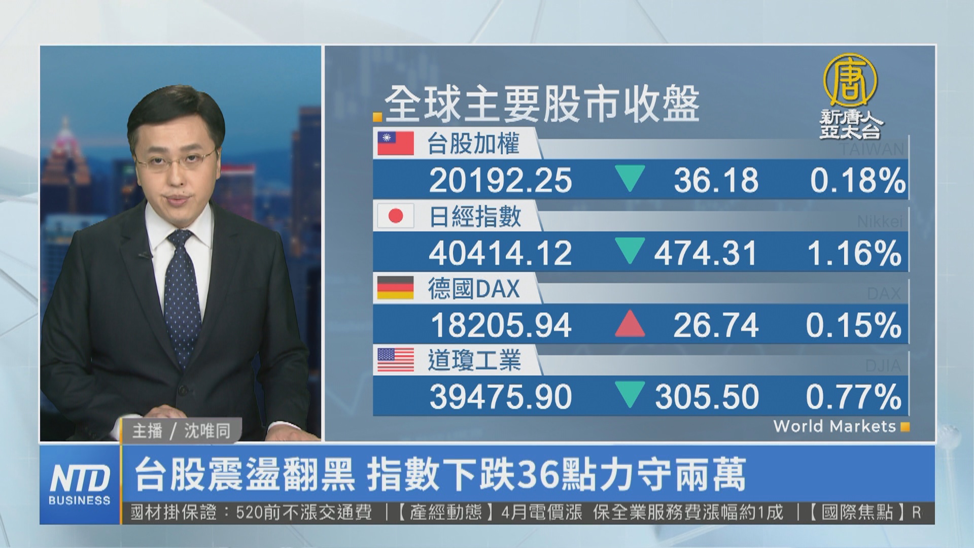 【新唐人亞太台 2024 年 03 月 25 日訊】美國股市四大指數,上週五(22日)漲跌互見,台股周一,由於台積電、聯發科走弱,電子、半導體股表現弱勢,AI概念股多數走跌,加上金融股熄火,加權指數尾盤翻黑,終場收在20192.25點,下跌36.18點,三大法人賣超54億。
