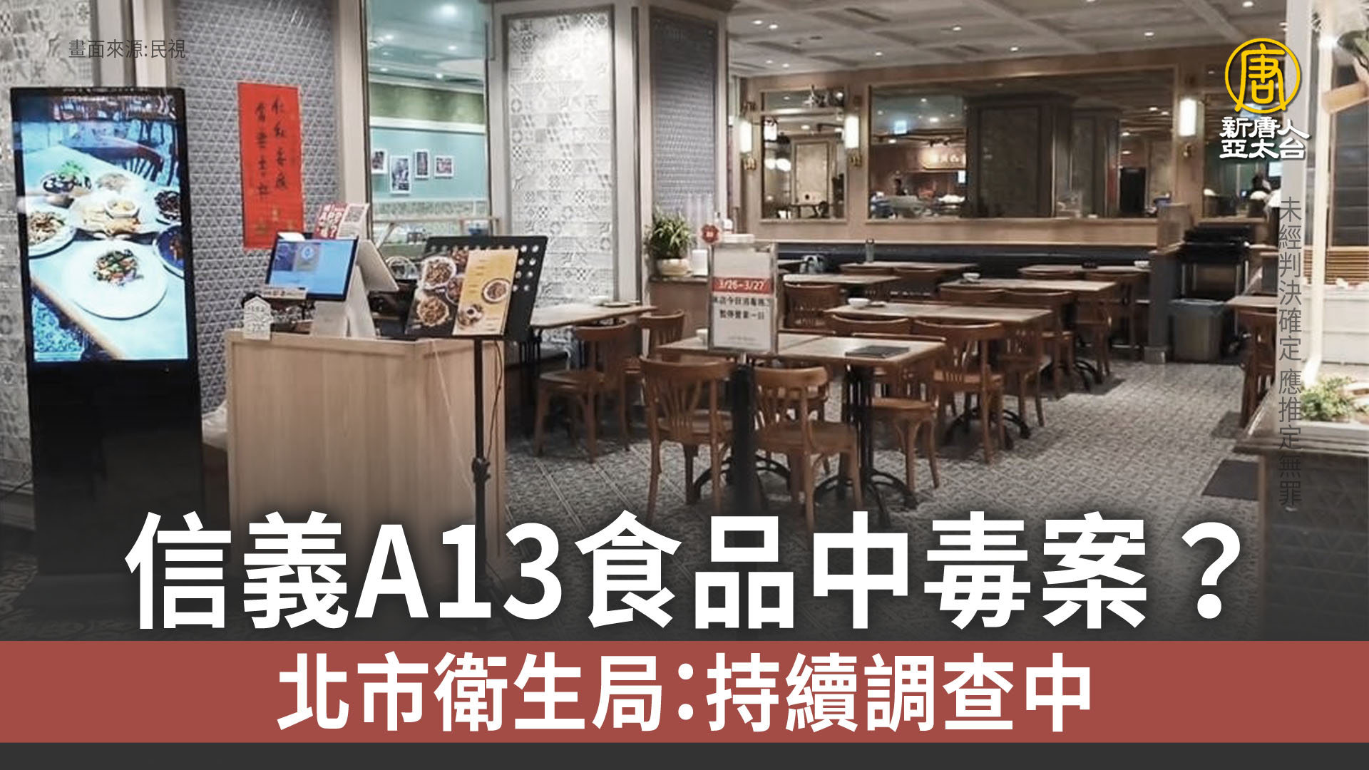 2024-03-27 07:02:26早安新唐人先來看到,台北市百貨餐廳疑食品中毒案持續擴大,已累計多人就醫、其中1人不治。北市衛生局26日晚間表示,陸續接獲醫院通報,用餐後出現不適症狀者增加至8人,其中6人就醫,已命業者停止供應餐點。衛福部次長王必勝也在26日晚間表示,因事態嚴重,有擴大趨勢,採樣將交由中央檢驗,若無法處理則會與毒物專家討論,盼速釐清。