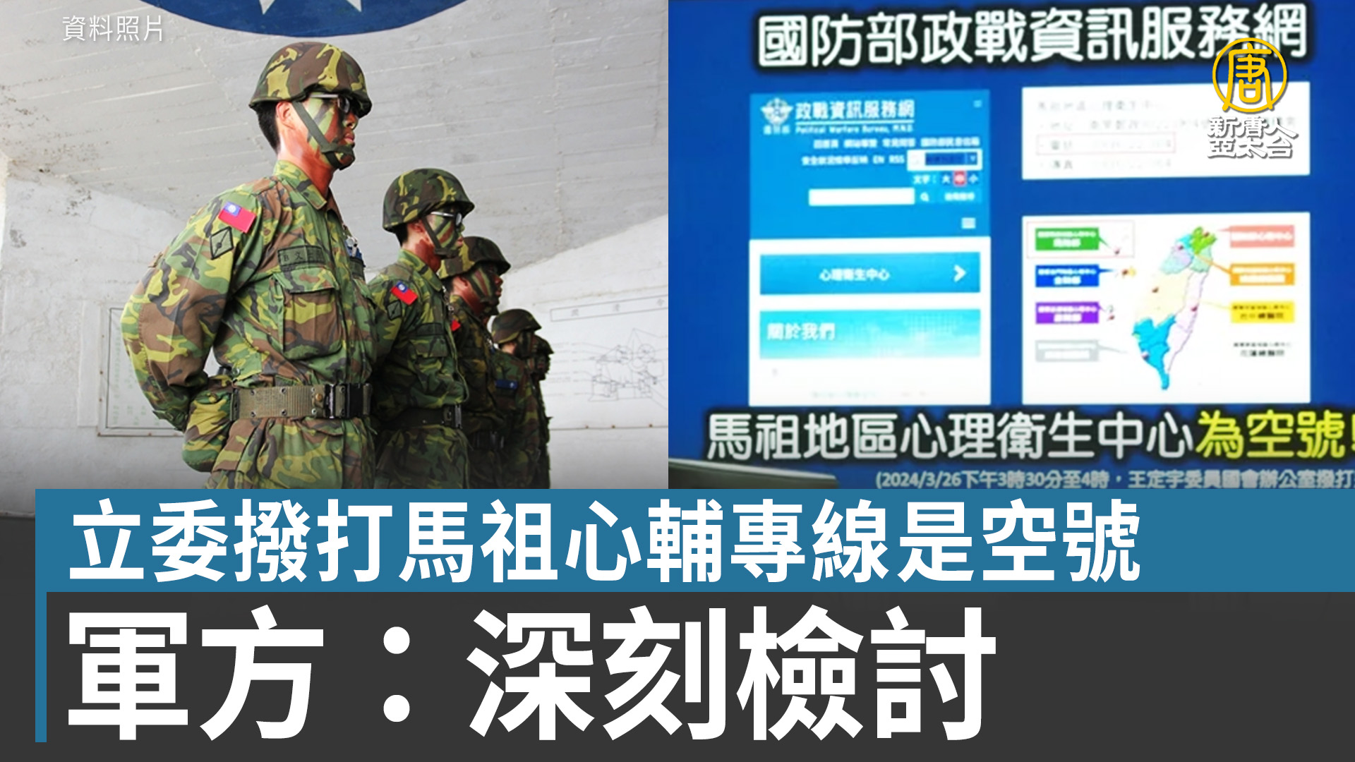 【新唐人亞太台 2024 年 03 月 27 日訊】國軍頻傳意外事件!3月份就有超過九起的軍人自我傷害案例。昨天(26日)又有一名航特部士官倒臥在營區內,目前在加護病房救治。國軍心理輔導受關注的時刻,立委還發現馬祖的軍隊心輔專線居然是空號,軍方今天表示,會深刻檢討。