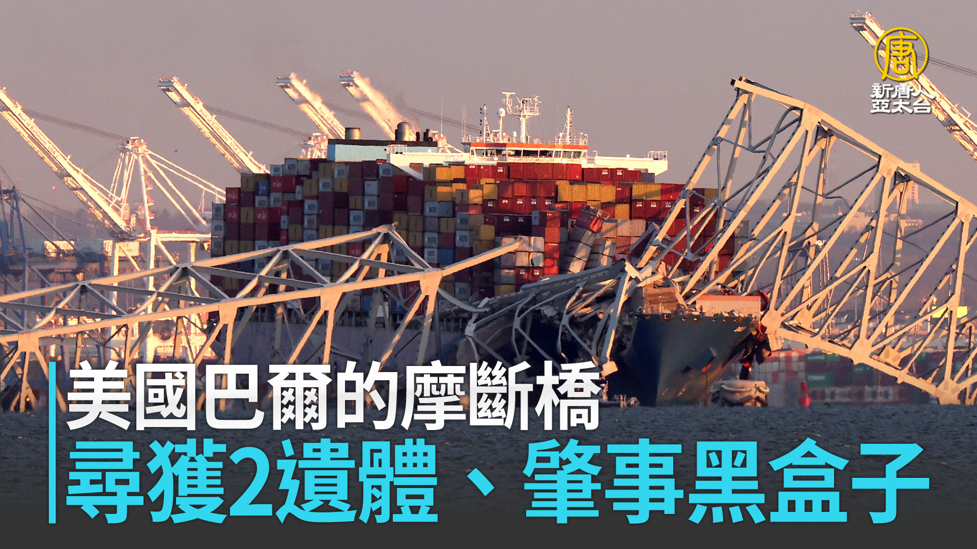 【新唐人亞太台 2024 年 03 月 28 日訊】歡迎回來。美國巴爾的摩大橋倒塌,6名工人墜橋,當局已尋獲2具遺體,還有4人下落不明。馬里蘭州已向聯邦政府提出緊急資金需求,調查人員也登上肇事貨船清查,並取得黑盒子,以釐清事故原因。
