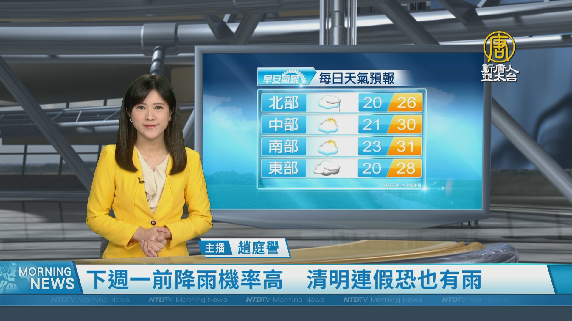 【新唐人亞太台 2024 年 03 月 29 日訊】歡迎您收看3月29日的早安新唐人,我是趙庭譽,先來帶您關心天氣。隨著鋒面通過,一直到下周一前,台灣各地將陸續會有雨勢出現,降雨最劇烈的時間點落在3月31日、4月1日兩天。另外,清明連假期間,降雨機率也會偏高,帶您一起來看到國際媒體重要訊息。