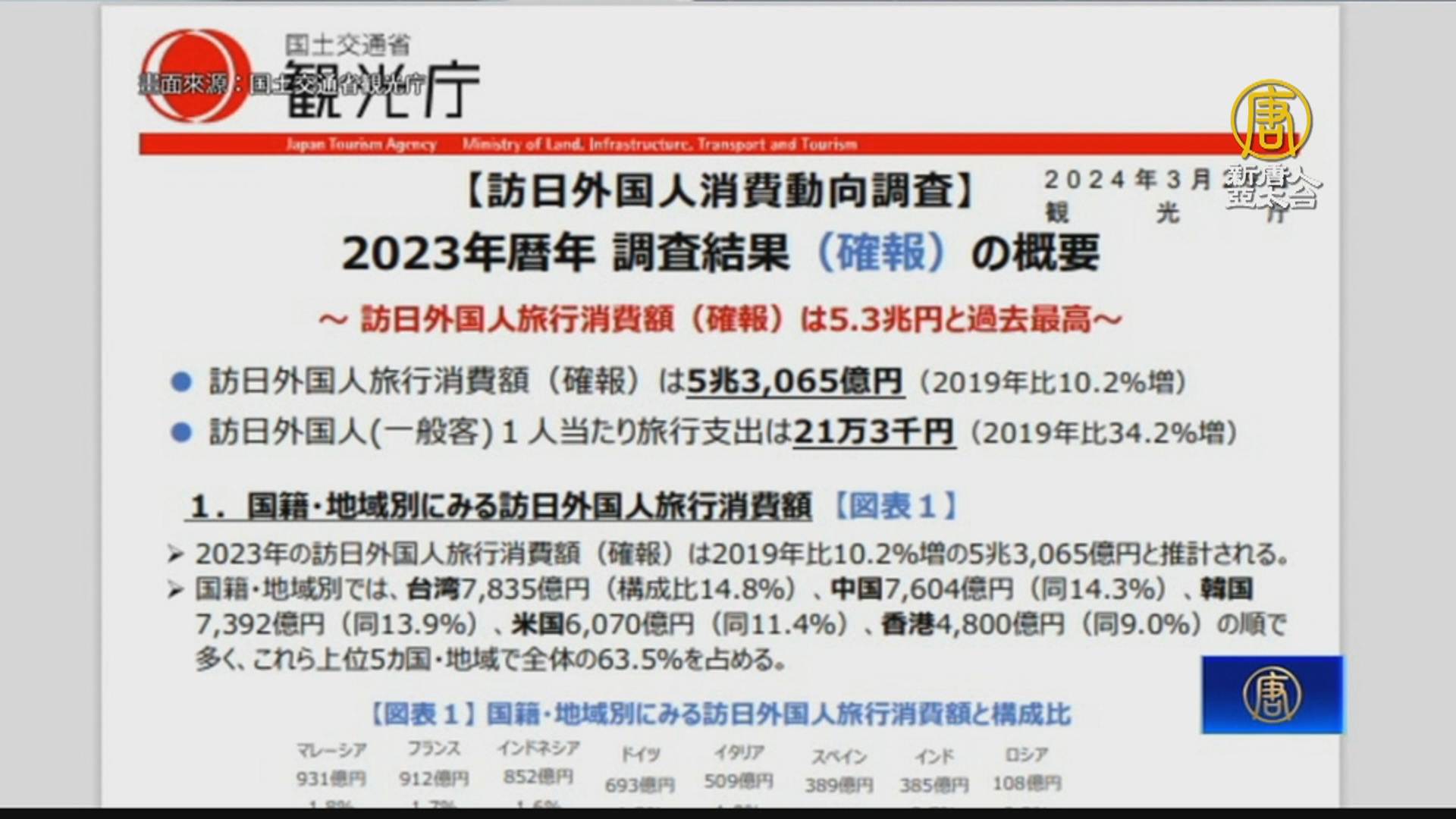 【新唐人亞太台 2024 年 04 月 02 日訊】日本觀光廳3月29日公布去年訪日外國旅客總消費金額,為5兆3065億日圓(約新台幣1.1兆元),比2019年成長10.2%,創下新高紀錄,以國別來看,台灣觀光客消費7835億日圓(約新台幣1655億元),占整體的14.8%居冠,中國以7604億日圓排行第2。