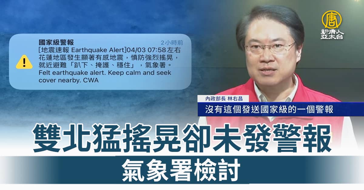 【新唐人亞太台 2024 年 04 月 03 日訊】上午7點58分花蓮強震全台有感,雙北民眾都感受到劇烈搖晃,不過國家警報卻沒有響起,遭到質疑。氣象署指出,包括桃園、雙北、基隆等6地預估震度未達四級,因此沒有發佈警報,後續將檢討改進。內政部長林右昌稍早也說明原因。