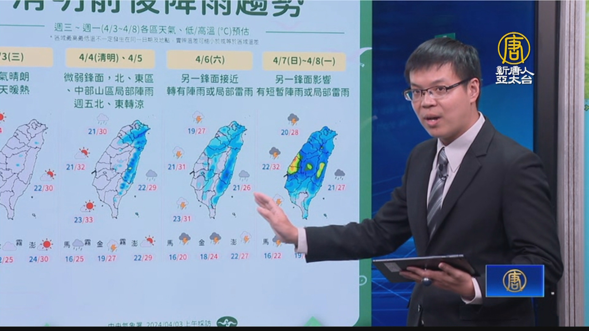 【新唐人亞太台 2024 年 04 月 03 日訊】今天各地天氣穩定,炎熱高溫,而清明連假即將到來,氣象署提醒,連假期間會有兩波鋒面接力報到,天氣環境較不穩定,局部地區有短暫陣雨或雷雨,民眾外出要記得攜帶雨具。