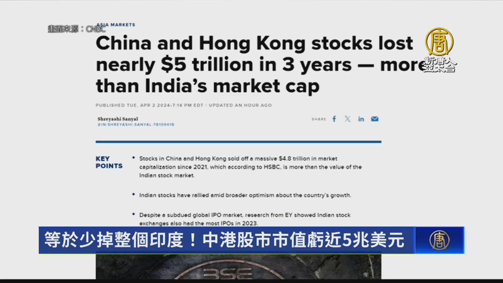 【新唐人亞太台 2024 年 04 月 03 日訊】中國經商環境大幅惡化,金融市場也看到端倪。外媒CNBC報導,根據匯豐銀行數據,2021年以來,中國和香港股市遭拋售的市值,高達4.8兆美元,這項數字超過了印度股市整體市值。外媒直指,這項統計數據對中國大陸或香港來說都不是好兆頭,疲弱的房地產市場成為中國經濟負面因素,也衝擊香港市場,反觀印度成為投資者的最愛,該國指數連續八年上漲,去年漲幅更是高達20%。