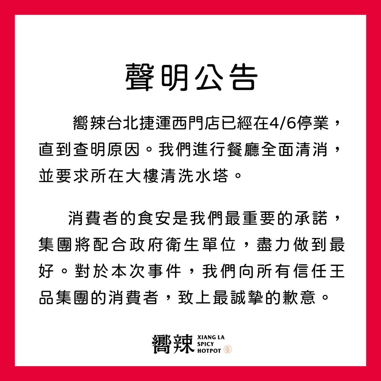 台北市衛生局接獲食物中毒通報,王品旗下餐飲「嚮辣」「初瓦」有22名民眾用餐疑似食物中毒就醫。衛生局稽查後發現,兩家餐廳內作業區有髒污等缺失,限期要求改善。王品聲明就事件致歉,表示兩家店已停業進行二度清消,也質疑大樓供水有疑慮,因為有住戶飲水後也發生同樣症狀,希望盡快查明原因。