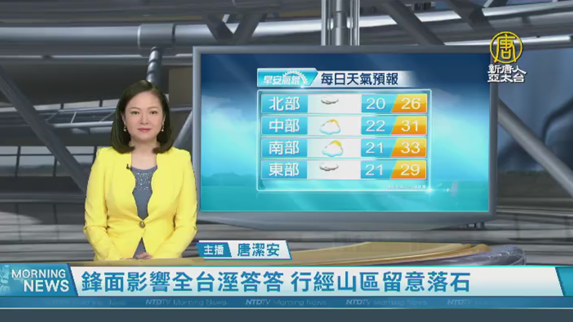 【新唐人亞太台 2024 年 04 月 08 日訊】歡迎您收看4月8日的早安新唐人,我是唐潔安,先來帶您關心天氣。受到鋒面影響,今天全台各地天氣不穩定,中部以北及宜蘭地區有局部短暫陣雨或雷雨,其他地區也有局部短暫陣雨,在氣溫方面,北部及宜、花高溫約24至26度,中南部及台東高溫約29至33度。另外由於近期地震頻繁,加上降雨機率較高,若非必要應避免前往山區活動,行經山區路段也要提高警覺。帶您來看到國際媒體重要訊息。