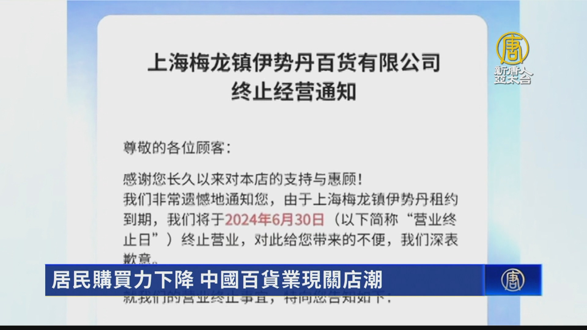 【新唐人亞太台 2024 年 04 月 08 日訊】中國經濟持續下滑,百貨零售業、不斷出現關店潮。據統計,超過7成的百貨商家反映,去年客流量仍然沒有回到2019年的水平。外界分析,居民購買力下降,是這其中最主要原因。