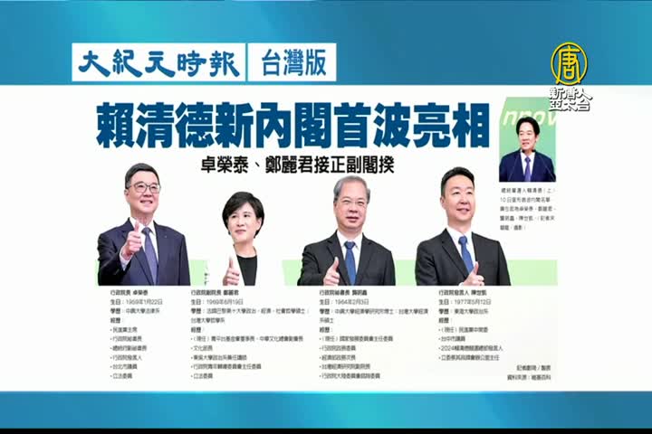 【新唐人亞太台 2024 年 04 月 11 日訊】接著看到大紀元時報台灣版報導:賴清德新內閣首波亮相,卓榮泰、鄭麗君接正副閣揆。