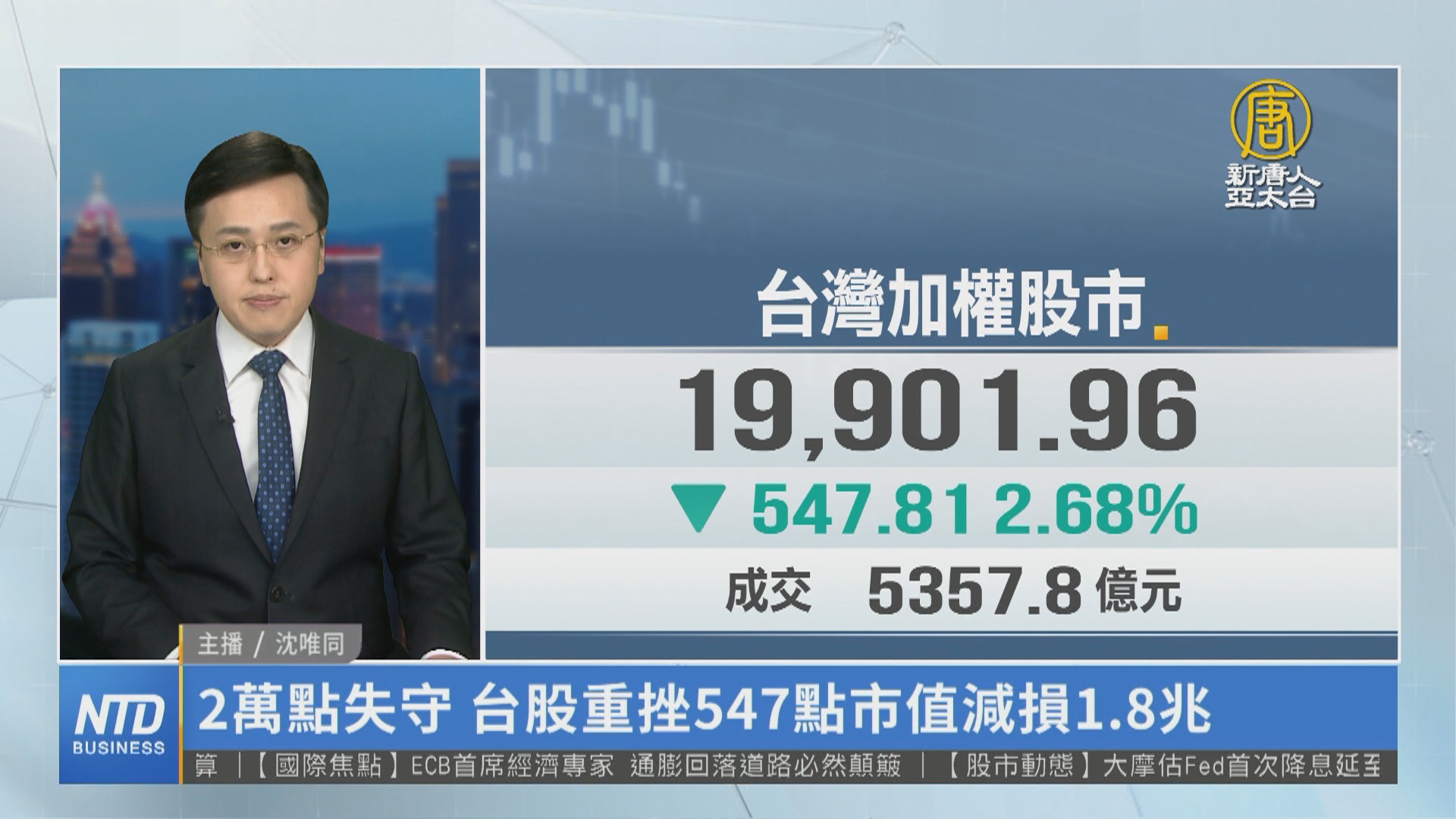 【新唐人亞太台 2024 年 04 月 16 日訊】美股道瓊指數,繼上週五大跌後,週一再度重跌,加上地緣政治紛擾、總體經濟因素,引發科技股帶頭下殺,台灣資本市場,週二股匯雙殺,新台幣盤中重貶1.36角,台股更是跌幅擴大,一路開低走低,台積電收盤大跌18元至788元,電子權表現弱勢,鴻海下跌3.5%,聯電跌近3%,聯發科重挫近5%。三大法人大舉賣超572億,讓台股市值單日蒸發1.8兆,下跌547點,收在19901點。