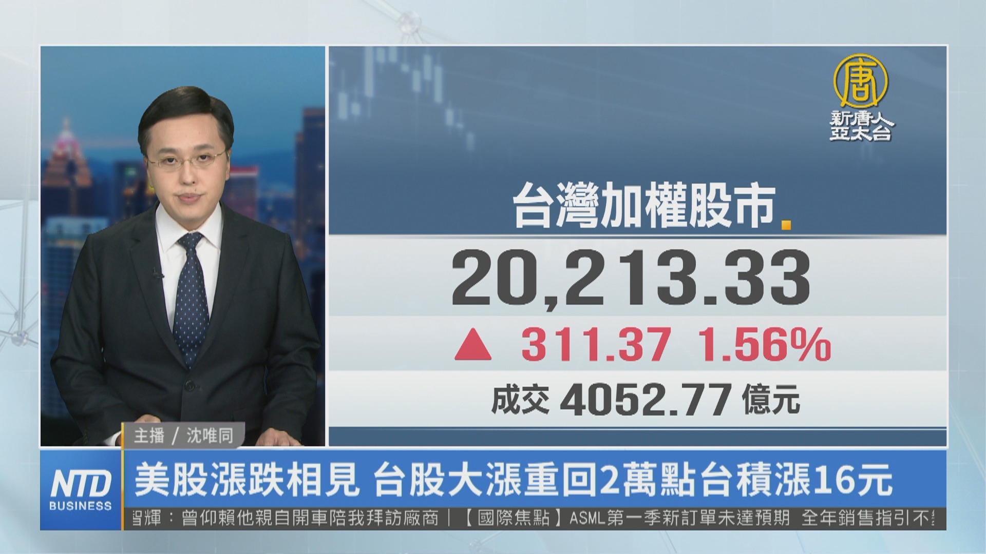 【新唐人亞太台 2024 年 04 月 17 日訊】新聞一開始帶您看國際股市。美國聯準會暗示不急於降息後,美債殖利率週二(16 日)攀高,一度觸及5%,美股震盪後漲跌不一,標普500指數和那斯達克綜合指數連三黑,道瓊止步連六跌。台股方面,今天(17日)適逢台指期結算,台積電股價走強,重新站上800元關卡,收在804元,上漲16元。終場在台積電等電子股拉抬下,大漲311.37點,收在20213.33 點,收復兩萬點大關。重電族群再度為市場焦點,多檔強攻漲停。法人表示,本週四台積電將召開法說會,市場樂觀看待釋出亮眼展望。