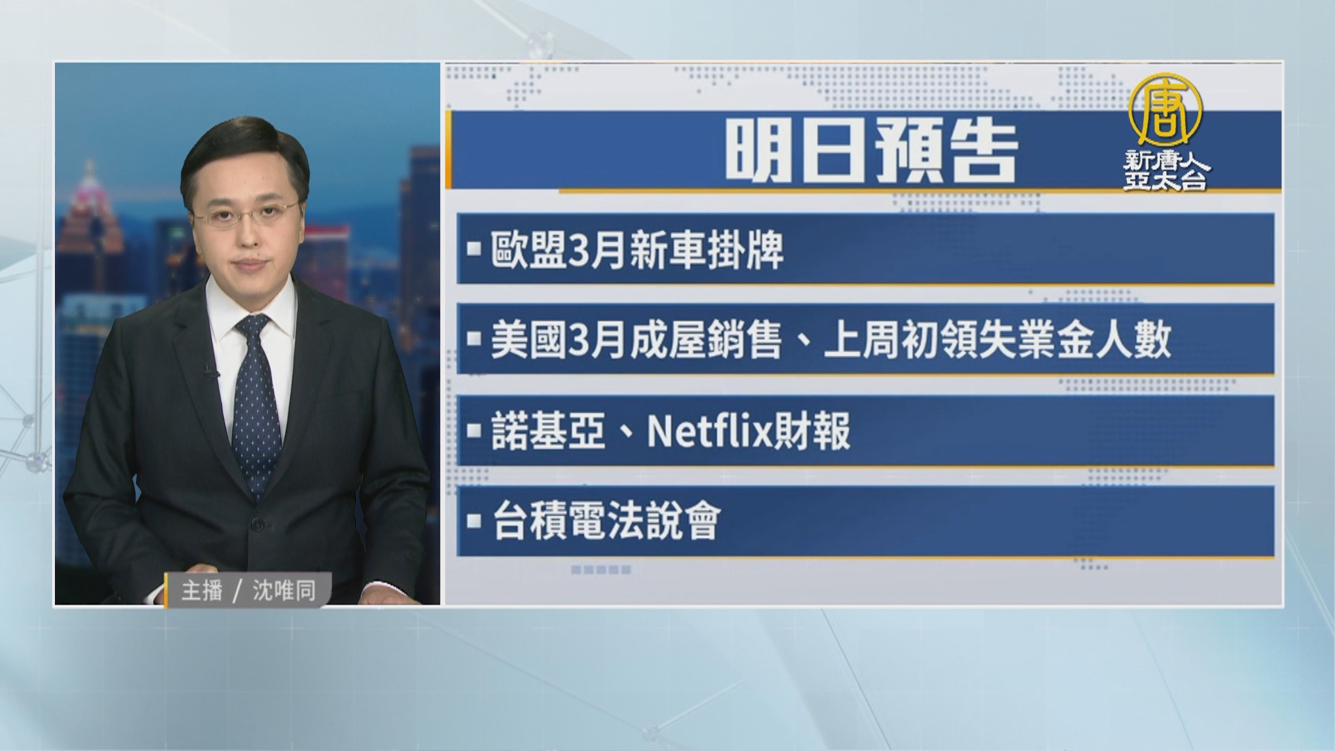 【新唐人亞太台 2024 年 04 月 17 日訊】帶您看到明天,4月18日,星期四,有哪些重要的財經活動。 歐盟3月新車掛牌;美國3月成屋銷售、上周初領失業金人數;諾基亞、Netflix財報;台積電法說會。