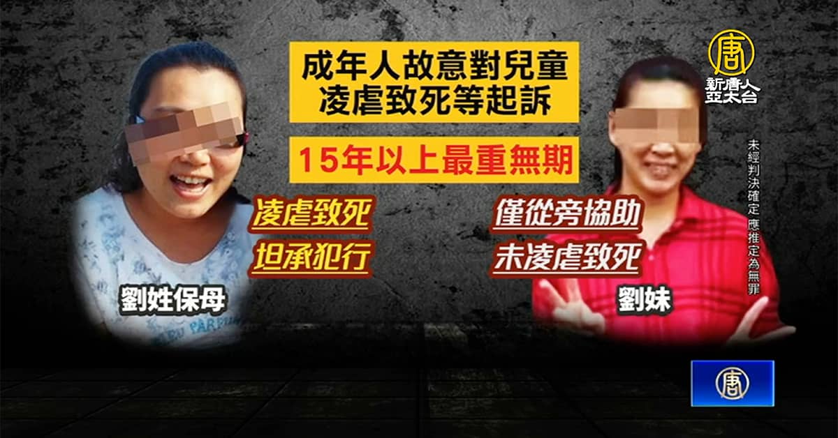 【新唐人亞太台 2024 年 04 月 18 日訊】劉姓保母和妹妹,涉嫌凌虐男童致死案,台北地檢署今天偵查終結,起訴劉姓保母姐妹兩人。因為案件涉及兒少法,刑期加重二分之一,刑度最少15年起跳,最重可判無期徒刑。