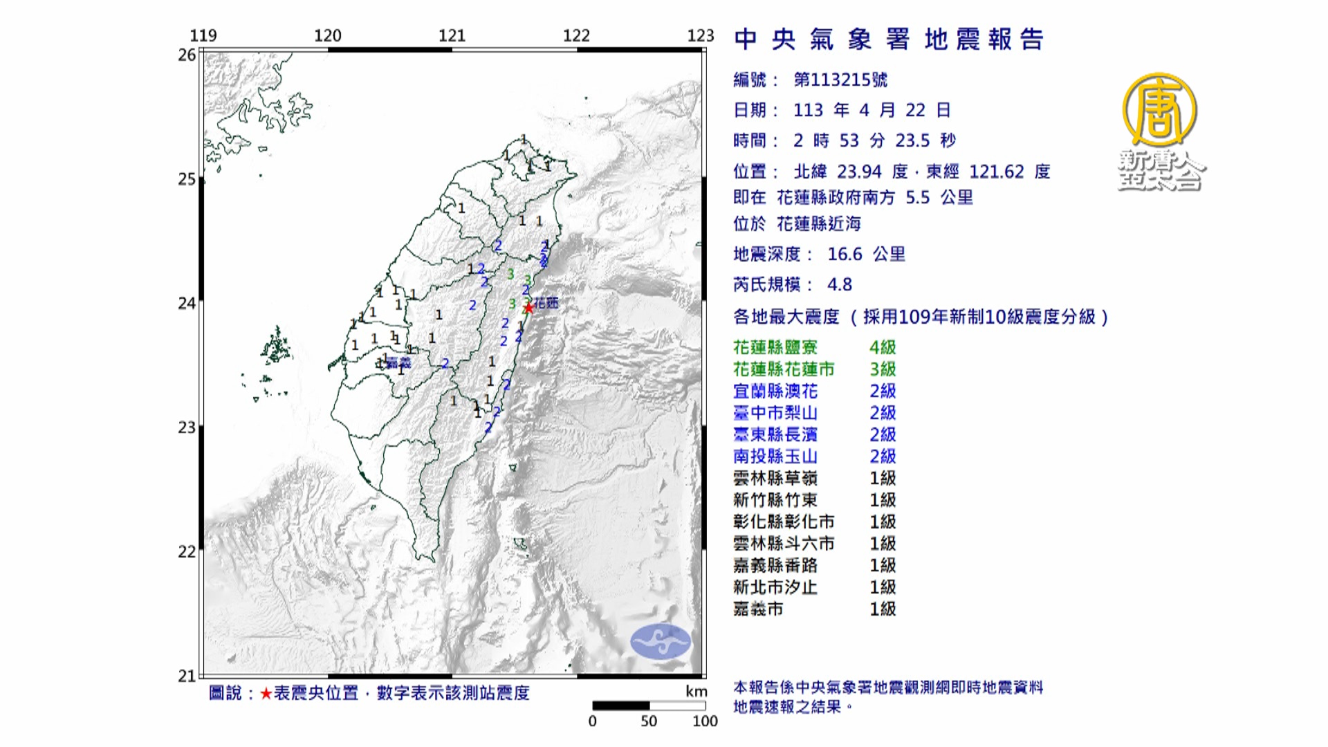 【新唐人亞太台 2024 年 04 月 22 日訊】早安新唐人先來關心,今天凌晨連續兩起地震,先是凌晨零點35分,在花蓮縣政府北北東方發生規模5.3地震,凌晨2點53分又發生規模4.8有感地震,震央位於花蓮縣近海,地震深度16.6公里。
