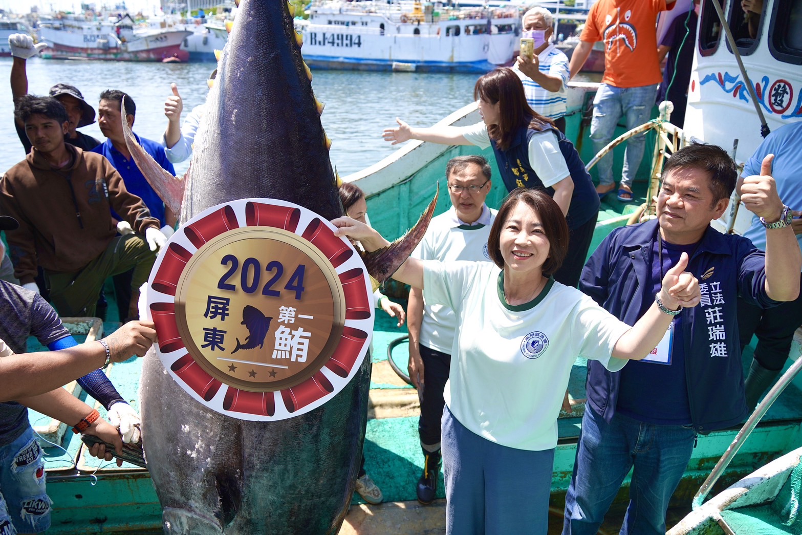 2024年4月21日,屏東縣長周春米親自為今年屏東「第一鮪」加冕掛牌。(圖/東港鎮漁會提供)