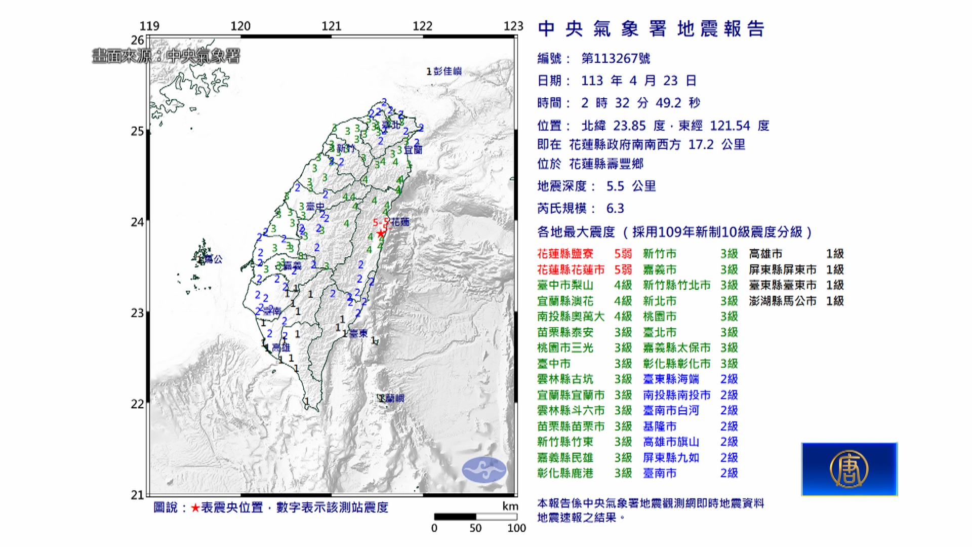 【新唐人亞太台 2024 年 04 月 23 日訊】早安新唐人先來關心,今天清晨多起地震,不少觀眾朋友都在睡夢中被搖醒,其中最大是發生在清晨2點32分的規模6.3地震,花蓮縣政府已經在清晨5點多宣布,今天停班停課。中央氣象署解釋,這是4月3日花7.2蓮強震的餘震,根據統計,403花蓮強震以來,有感餘震已經超過一千次,氣象署提醒民眾,近期下山區土石鬆脫,加上下雨,盡量不要往山區活動。