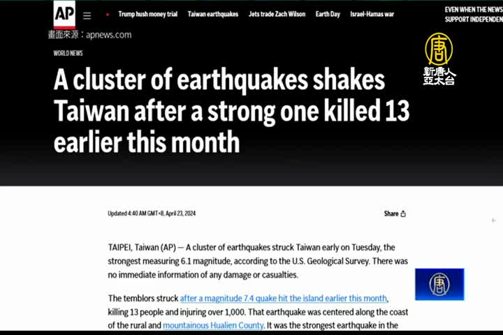 【新唐人亞太台 2024 年 04 月 23 日訊】花蓮403地震至今已將近3週,今晨又發生80多起大小不同的餘震,讓許多人一夜難眠,多家外媒也陸續跟進關注。《美聯社》報導,今晨餘震規模達到6,不過台灣對地震並不陌生,有出色的防震準備,地震對2300多萬居民造成的損失相對較小。《路透社》說,台灣東海岸發生了80多次地震,目前還沒有人員傷亡報告傳出。《法新社》採訪台北的外籍遊客描述地震實況。