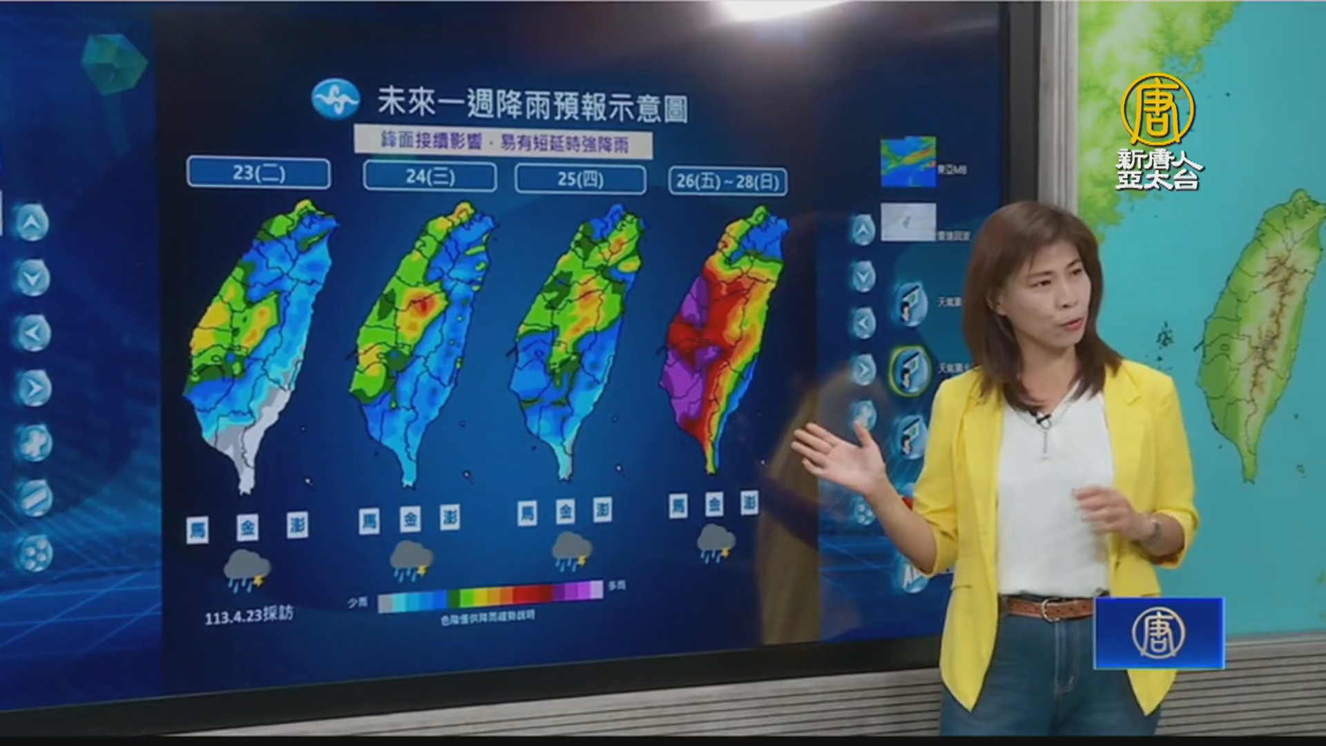 【新唐人亞太台 2024 年 04 月 23 日訊】今天鋒面影響,各地降雨機率增高,將會出現陣雨或雷雨,西半部地區有局部大雨發生的機率,東北部也有較大雨勢,可能伴隨雷擊和強陣風,低窪地區也要慎防積水。