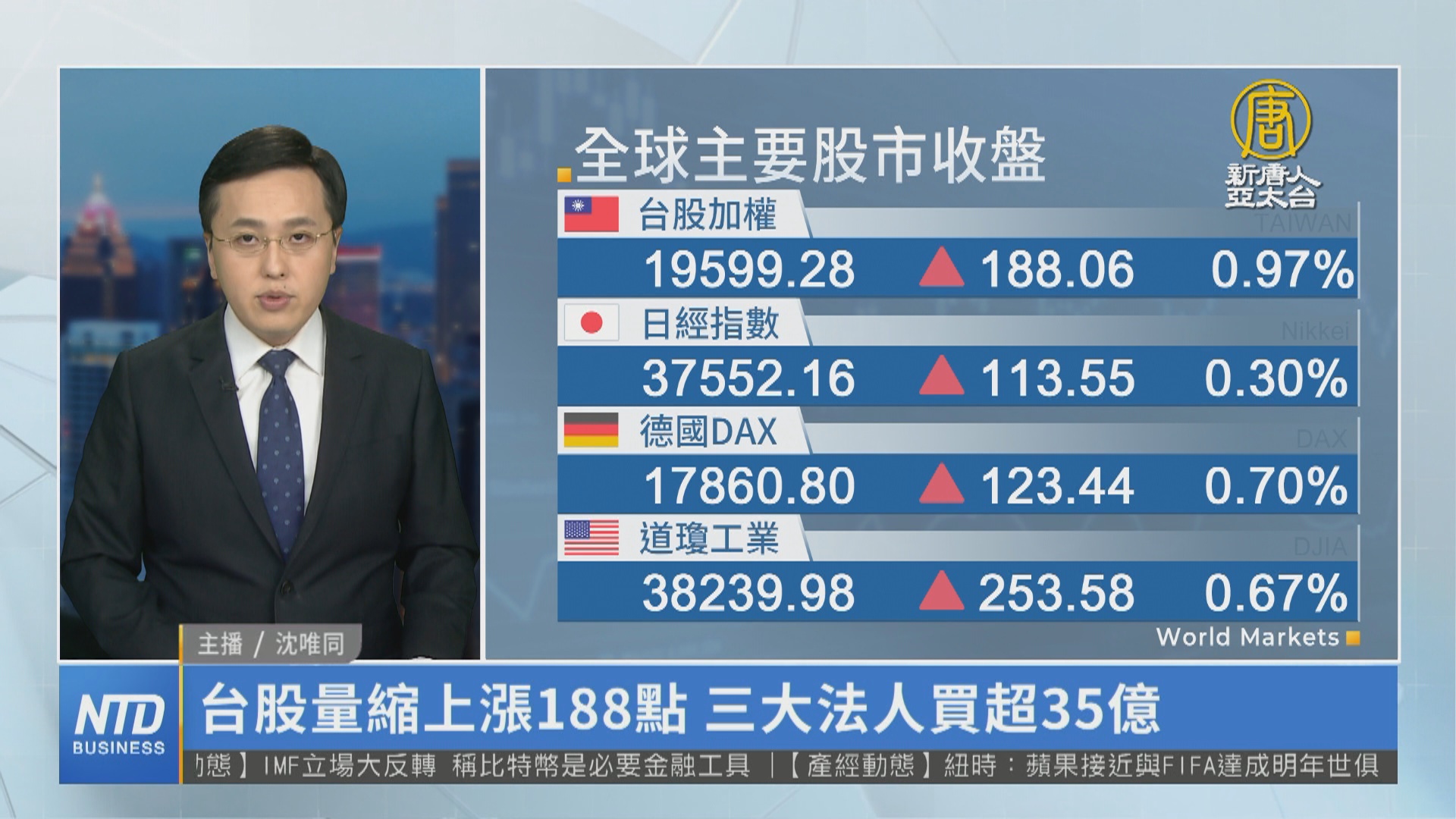【新唐人亞太台 2024 年 04 月 23 日訊】中東緊張局勢有所和緩,美股主要指數週一震盪走高,標普收紅,重返 5000 點大關,結束連續六天暴跌。投資人靜待科技業財報、美國關鍵通膨數據出爐,在美股止跌情況下,台股週二跌深反彈,台積電最高攻上761,收盤上漲12元至754點,帶動加權指數收在19599.28點,上漲188點。三大法人走向來看,外資轉賣為買,買超14.83億,投信續買超,合計三大法人買超台股35.23億。