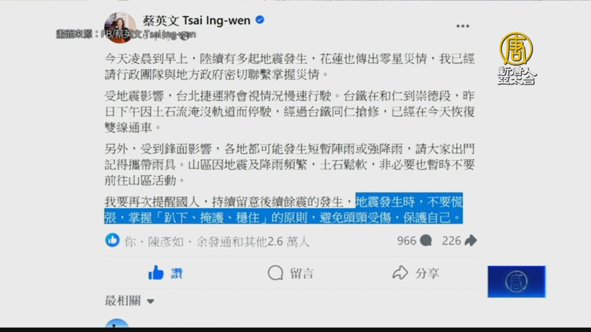 【新唐人亞太台 2024 年 04 月 23 日訊】這兩天餘震不斷,不少人認為地震發生時要先去開門,再趕快躲起來,但其實這個說法是錯誤的,正確觀念其實是要立刻採取趴下、掩護、穩住的動作。內政部先前說明,因為地震發生時,許多家具可能會傾倒,物品掉落、移位或翻覆,造成人被砸傷或壓住,所以強震來襲時,千萬不要四處奔跑。總統蔡英文也在社群平台發文提醒,「地震發生時,不要慌張,掌握『趴下、掩護、穩住』的原則,避免頭頸受傷,保護自己。」