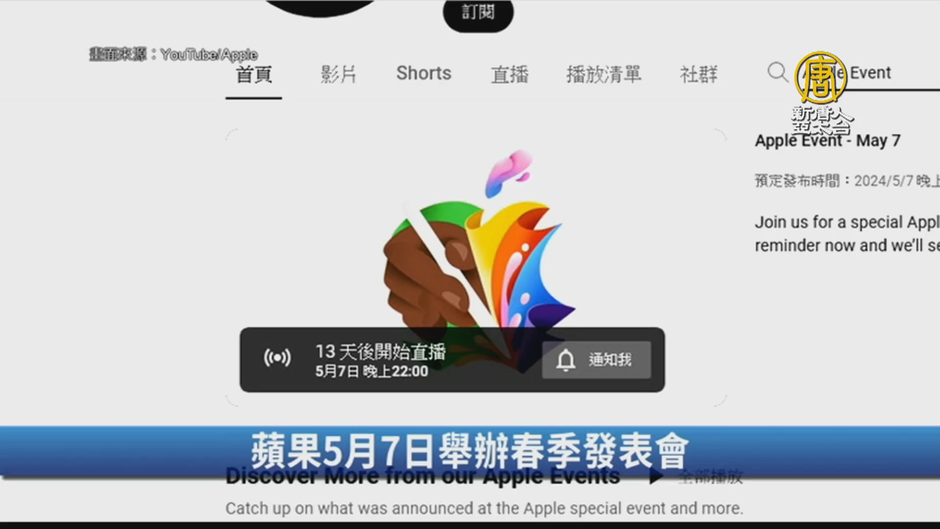 【新唐人亞太台 2024 年 04 月 24 日訊】蘋果5月7日舉辦春季發表會