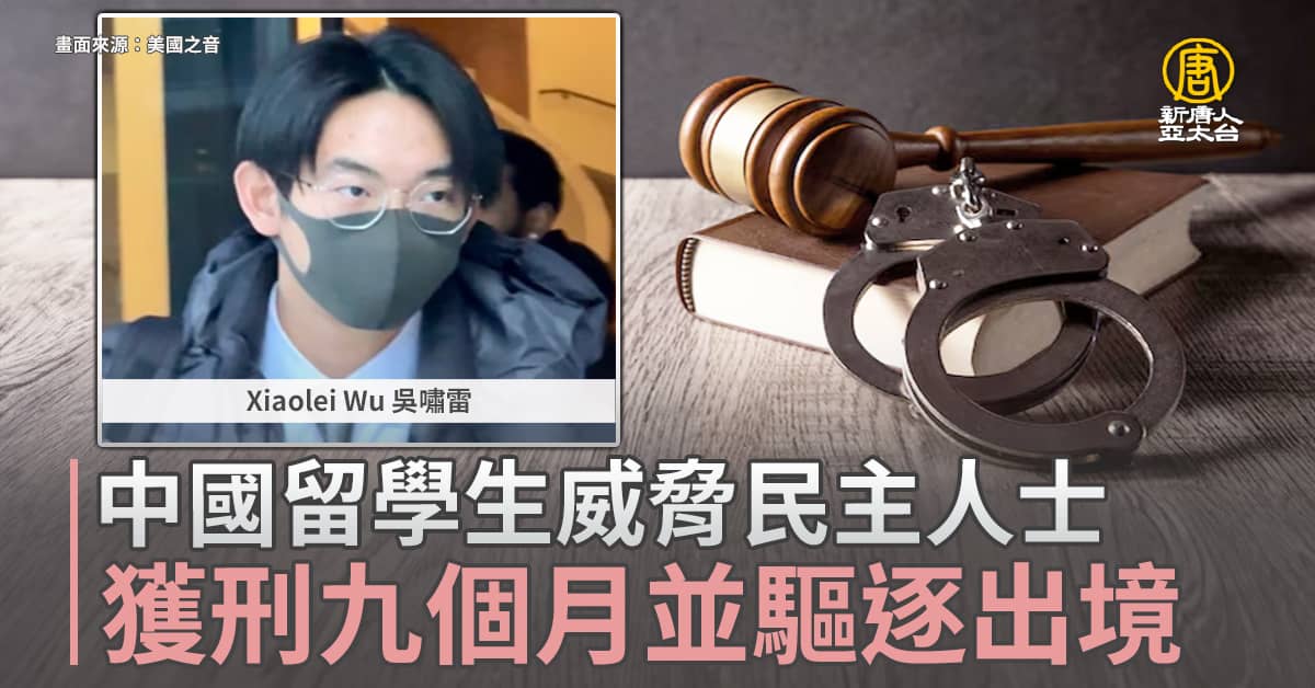 【新唐人亞太台 2024 年 04 月 25 日訊】美國伯克利音樂學院的一名中國留學生「吳嘯雷」,因為威脅和騷擾同校支持民主的中國學生,週三被判刑9個月,3年監督釋放,隨後驅逐出境。