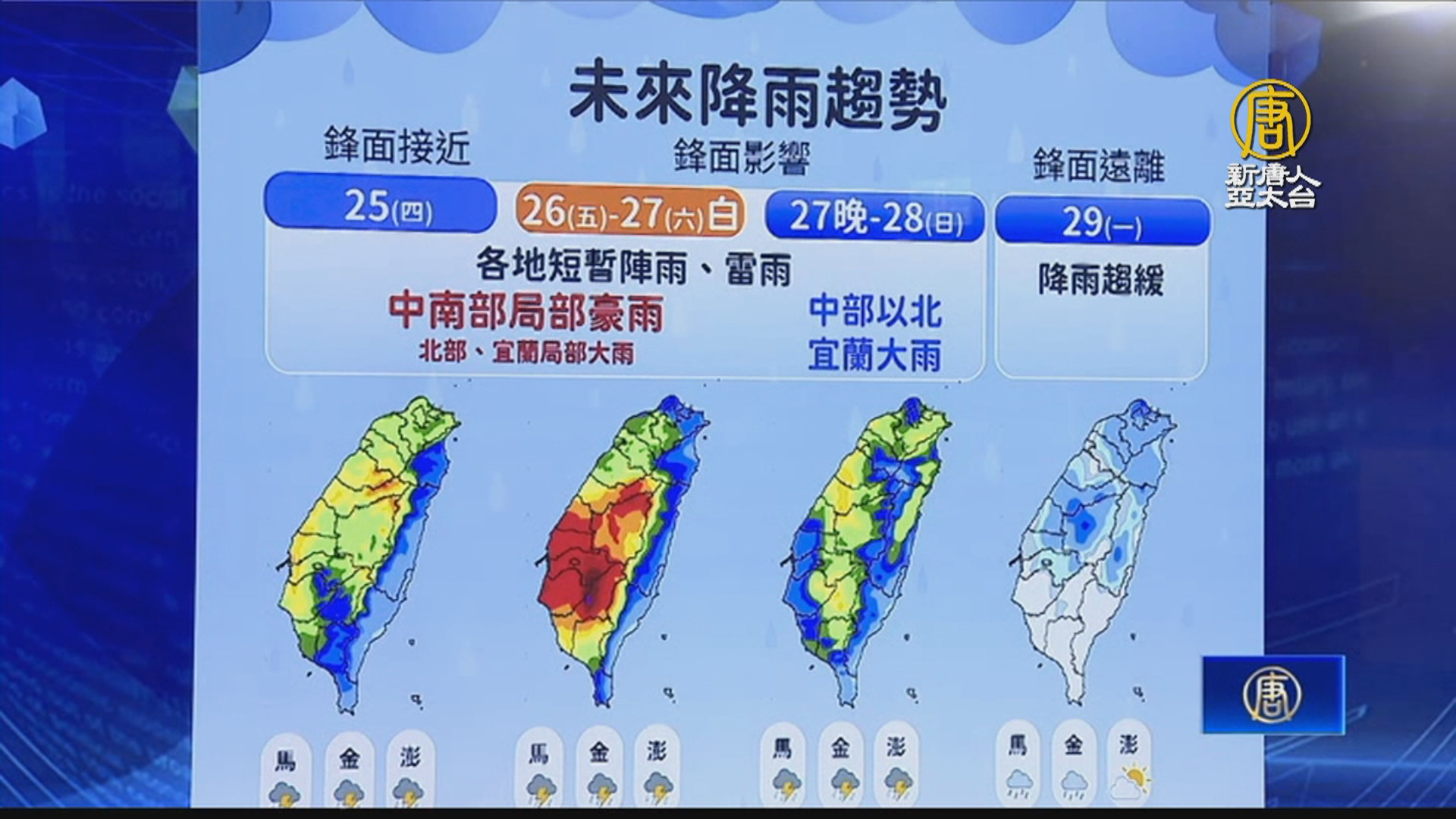 【新唐人亞太台 2024 年 04 月 25 日訊】新聞開始先來關心,前一波鋒面剛走,週五又會有另一波鋒面報到,加上鋒面前緣的西南風,降雨熱區在中南部,可能出現局部豪大雨,甚至短延時豪雨,伴隨雷擊和強陣風。而這波鋒面將會一路影響到週日,緊接著,下週又有鋒面逼近。
