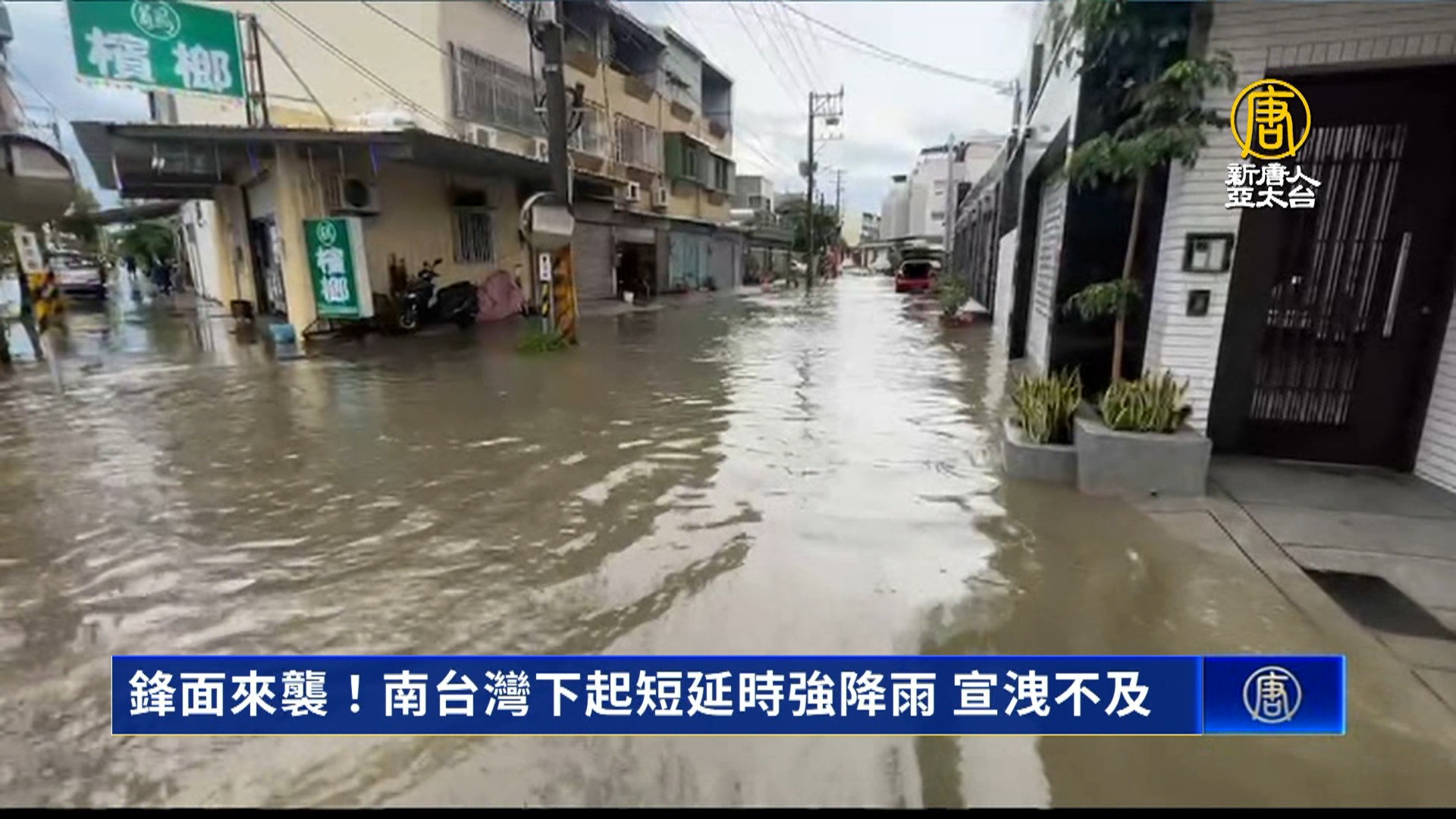 【新唐人亞太台 2024 年 04 月 26 日訊】受到鋒面影響,週四、週五兩天,南台灣下起短延時強降雨,台南今天早上下起大雷雨,其中位在仁德的民安路,瞬間大雨宣洩不及,水淹15公分。高雄中山大學宿舍,還因露台排水孔堵塞,造成宿舍大淹水。