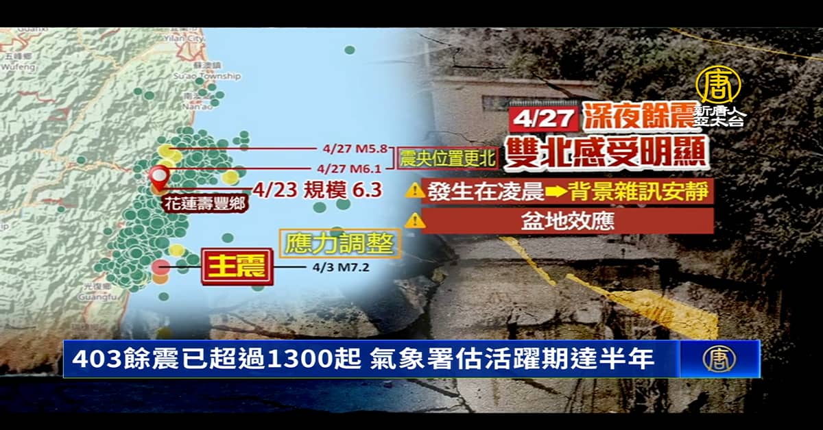 【新唐人亞太台 2024 年 04 月 27 日訊】今天深夜,相信不少人都從睡夢中驚醒!凌晨2點21分,花蓮又發生規模6.1的餘震,氣象署表示,餘震恐怕還會持續3-6個月,規模也可能達到6以上。