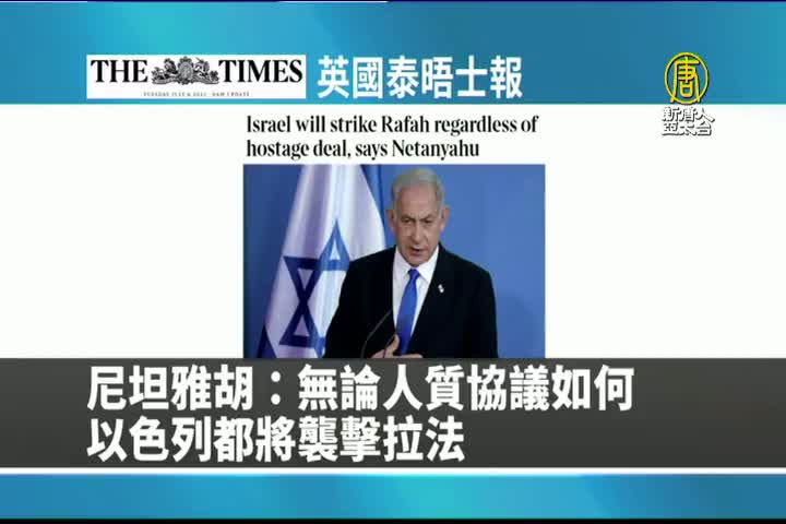 【新唐人亞太台 2024 年 05 月 01 日訊】接著是英國泰晤士報的報導:以色列總理尼坦雅胡表示,無論人質協議如何,以色列都將襲擊拉法。