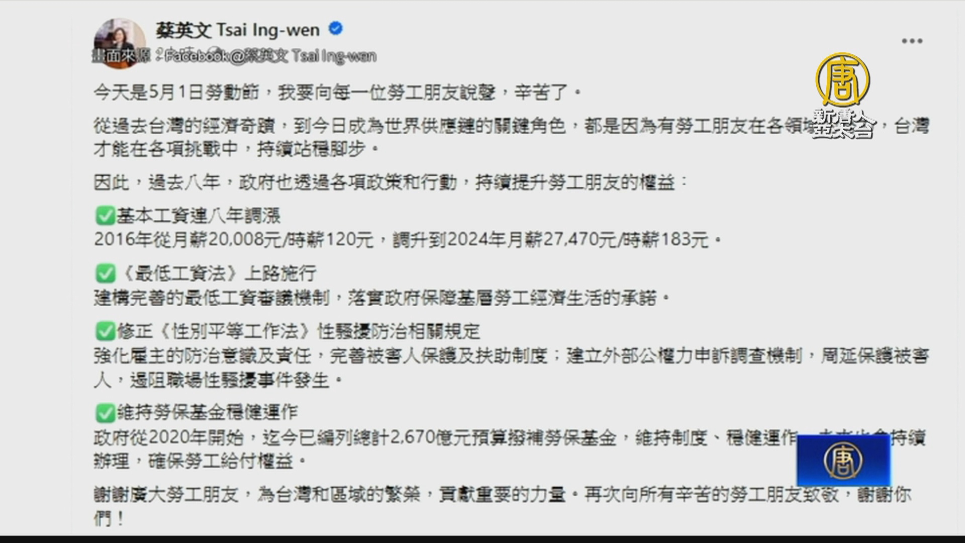 【新唐人亞太台 2024 年 05 月 01 日訊】再來看到,今天是五一勞動節,總統蔡英文上午在社群媒體發文指出,要向每一位勞工朋友說聲,辛苦了。從過去台灣的經濟奇蹟,到今日成為世界供應鏈的關鍵角色,都是因為有勞工朋友在各領域的努力,台灣才能在各項挑戰中,持續站穩腳步。蔡總統列舉四大政績,包括,基本工資連八年調漲、維持勞保基金穩健運作等,表達對勞工的支持。