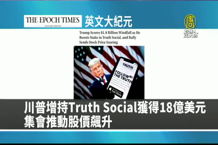 【新唐人亞太台 2024 年 05 月 02 日訊】首先來看到美國大紀元英文版報導:川普增持社群媒體Truth Social,獲得18億美元,集會推動股價飆升。