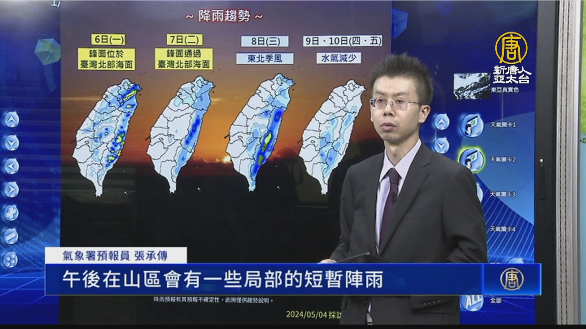 【新唐人亞太台 2024 年 05 月 04 日訊】週六(4日)全台天氣穩定,溫度也飆高,西半部高溫超過30度、東部28度,但北部和中南部山區,午後有局部短暫雷陣雨。週日(5日)跟好天氣說掰掰,鋒面接近,各地有較大雨勢,下週一(6日)北部、東部也有雨,直到週三(8日)後水氣才減少。