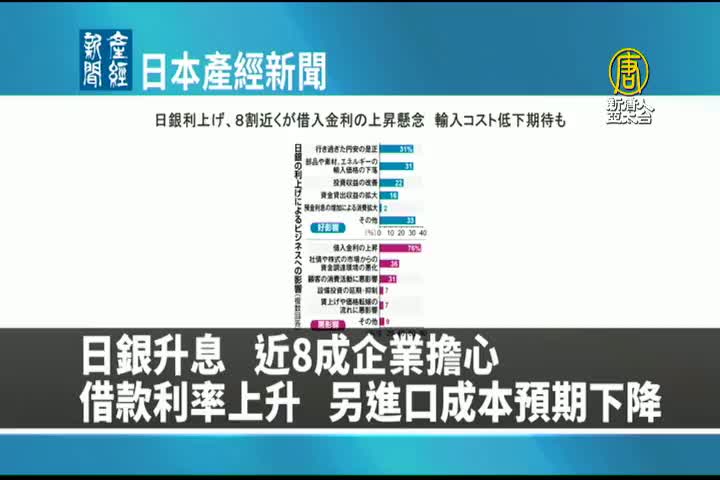 【新唐人亞太台 2024 年 05 月 06 日訊】來看到日本產經新聞報導:日本央行取消負利率政策,將近8成的企業擔心借款利率上升,而進口成本將預期下降。