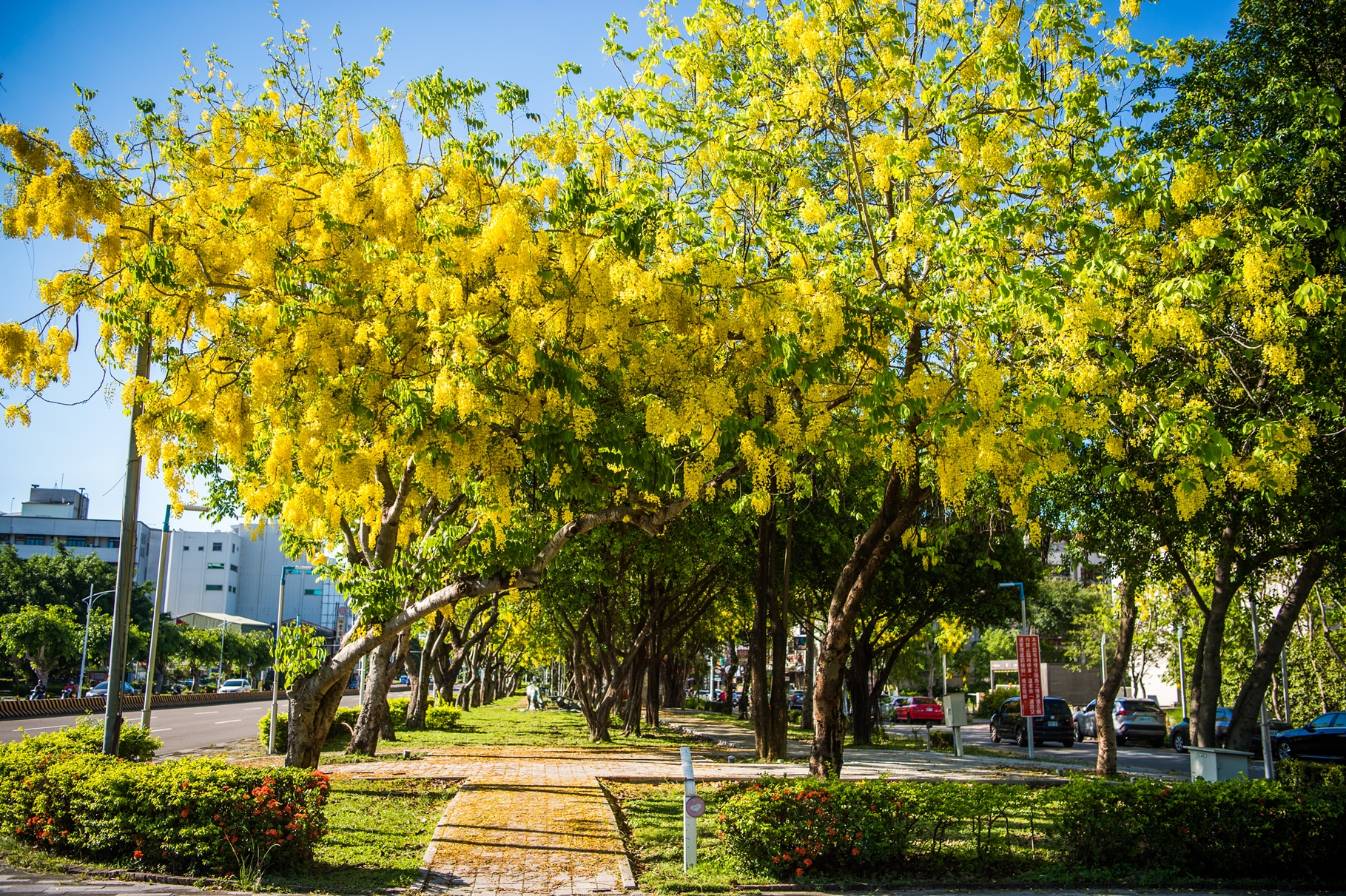 嘉義市自由路、世賢路分隔島上的林蔭大道,長達1.2公里的「金黃隧道」,每年5、6月是阿勃勒盛開花期,把自行車道妝點的很浪漫。(嘉義市政府提供)