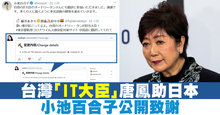 台灣「IT大臣」唐鳳助日本 小池百合子公開致謝