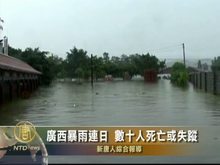 2010-06-03 16:01:04廣西由於暴雨引發山崩,埋沒了房屋並阻斷了道路,截至星期四(6月3日),死亡人數已經上升到38人,還有至少14人失蹤。