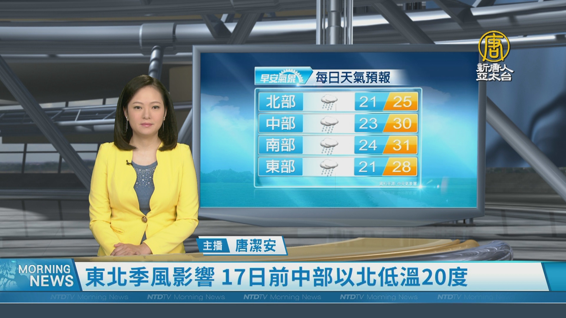 【新唐人亞太台 2024 年 05 月 13 日訊】歡迎您收看5月13日的早安新唐人,我是唐潔安,先來帶您關心天氣。本週有2波東北季風,昨天晚上到今天上午,是本週水氣最多的時間,各地有局部短暫陣雨或雷雨;星期五17日清晨前,中部以北普遍低溫約20度,日夜溫差約8、9度。提醒觀眾朋友留意。帶您一起來看到國際媒體重要訊息。