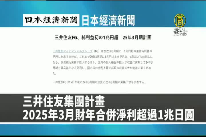 【新唐人亞太台 2024 年 05 月 14 日訊】來看到日本經濟新聞報導:三井住友金融集團計畫在 2025 年 3 月的財年合併淨利超過 1 兆日圓。